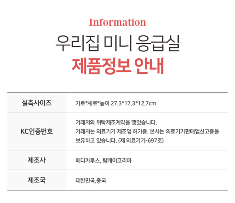 A. 시중에 판매하는 구급함의 경우에는 밴드, 면봉, 거즈 등의 기초적인 물품들로만 구성이 되어 있어 실제로 발생 할 수 있는 여러 상황의 응급 상황을 적절히 처치 하기에 많은 한계가 있습니다. 많은 환자분들이 작은 사고에도 응급실을 찾으시지만, 잘 갖춰진 응급 키트가 있다면 많은 상황을 집에서도 잘 처치 할 수 있습니다.