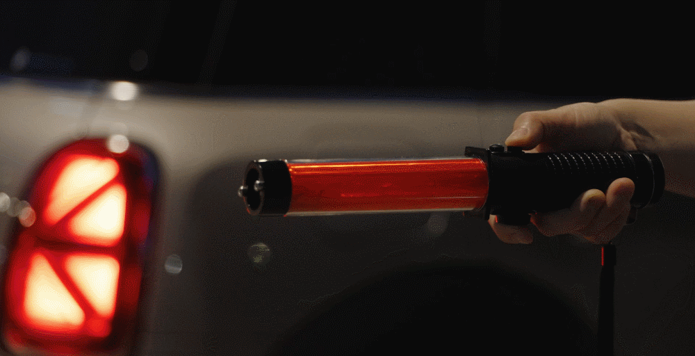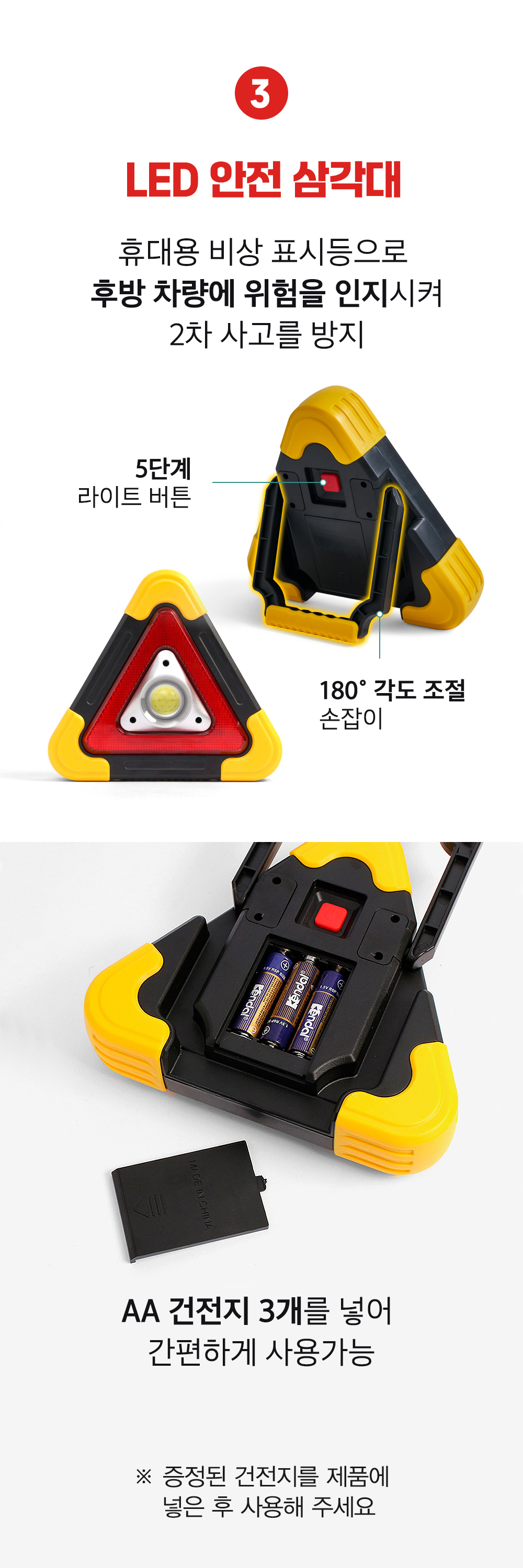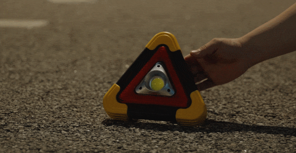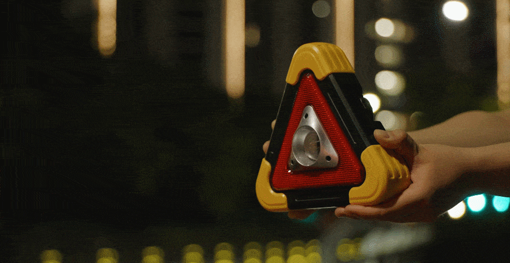 버튼을 누르면 1-5번 순서로 라이트가 켜집니다. (순서 : 전면 라이트 점등 강하게 > 전면 라이트 점등 약하게 > 삼각 비상등 점등 > 삼각 비상등 점멸 > 삼각 비상등 점멸 2회 깜박임 > OFF