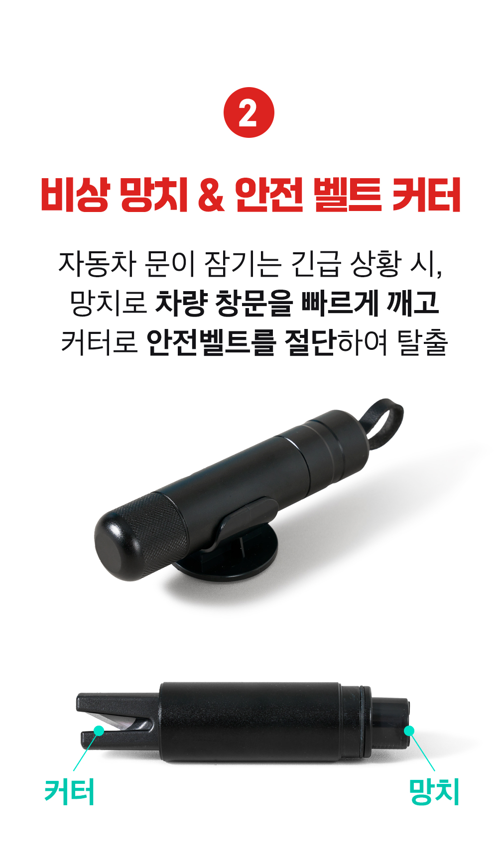충돌 사고, 이물질 유입, 벨트 마모, 버클 불량, 센서 오작동 등으로 안전벨트에 고장이 발생했을 경우, 망치 뒷면의 안전벨트 커터를 이용해 신속히 벨트를 절단하세요