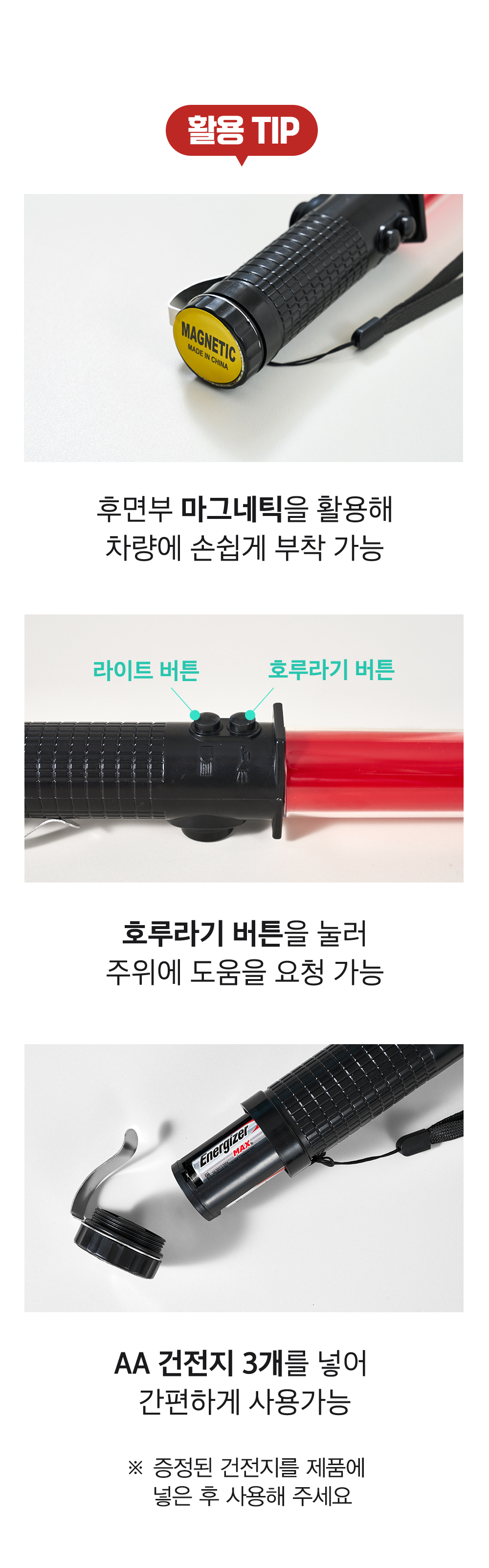 신호봉 뒷면의 자석을 활용해 차량에 간편하게 부착하여 사용할 수 있습니다.
