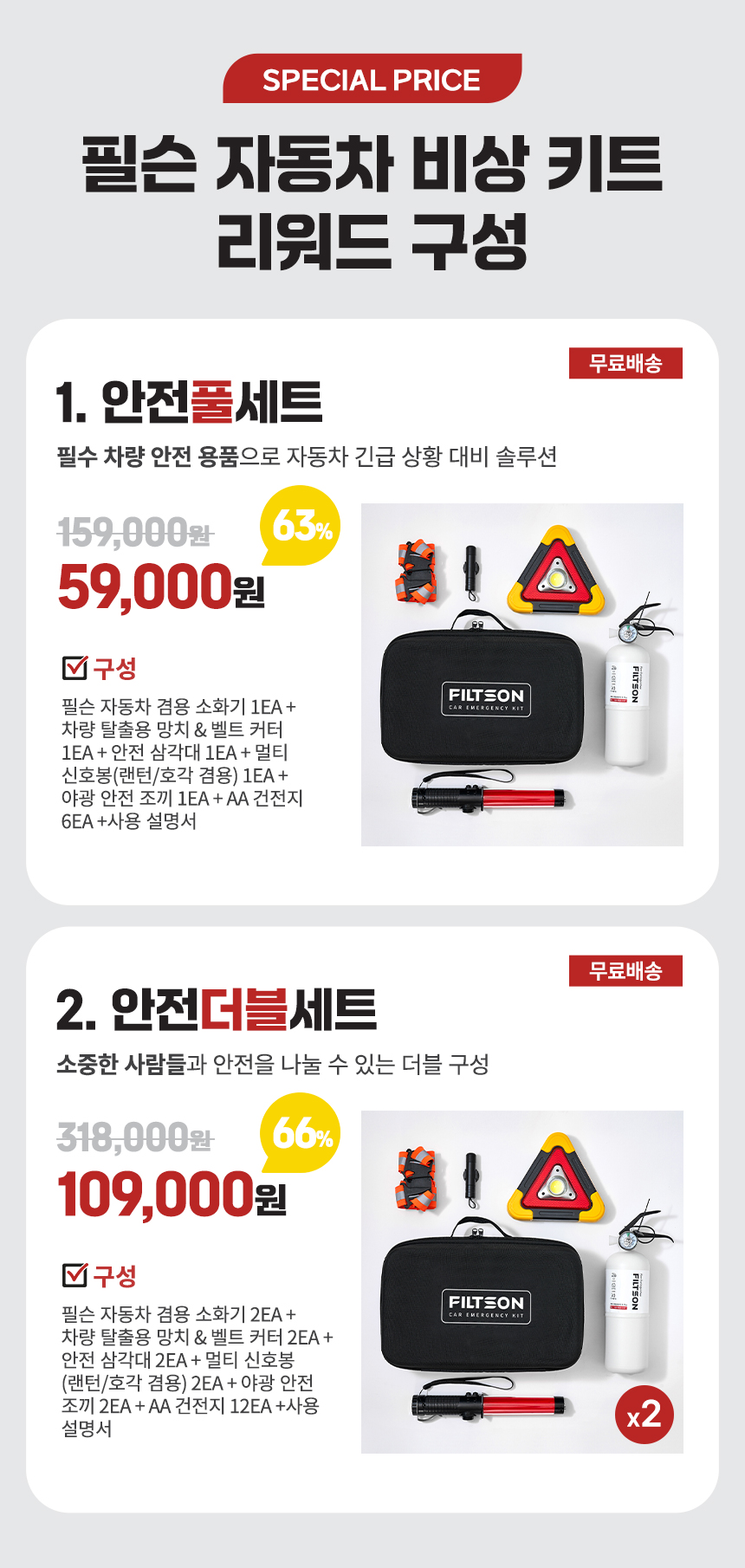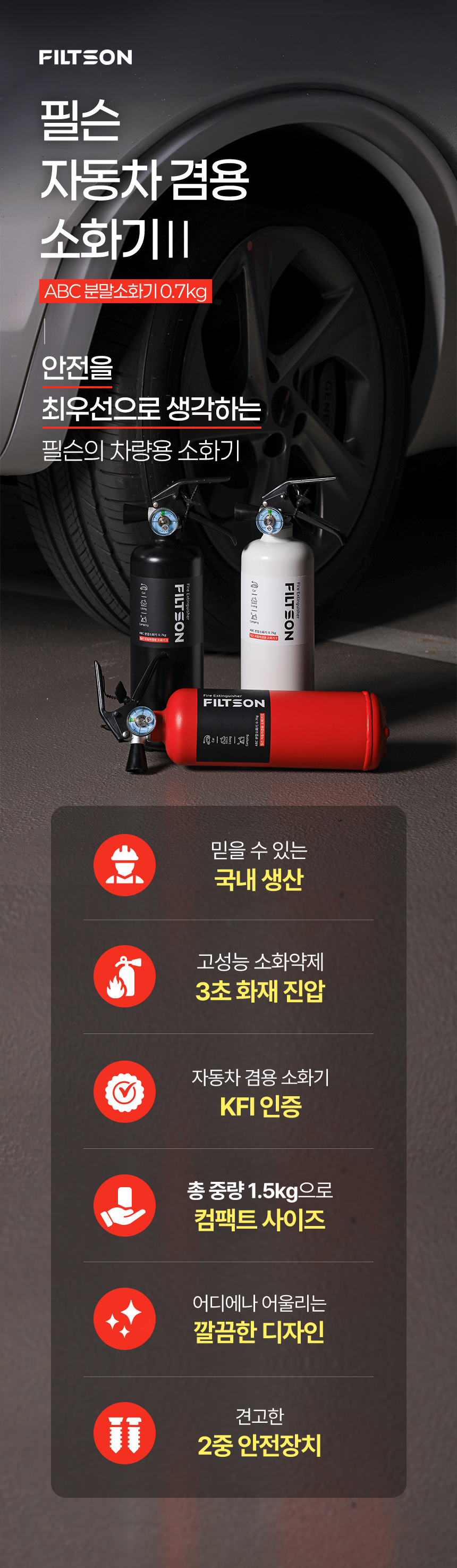 필슨의 자동차 비상 키트는 1·2차 펀딩을 통해 아주 큰 호응을 얻었고, 서포터님들의 소중한 피드백과 함께 수많은 재오픈 요청을 받았습니다 : ) 이번 프리오더에서는 먼저 사용하신 분들의 피드백을 반영하여 소화기의 디자인을 보다 견고하게 리디자인 했고, 온라인 최저가 대비 43% 할인된 와디즈 특별가로 다시 소개드립니다. 더 많은 분들이 자동차 주행 중 발생할 수 있는 다양한 위기 상황에 대해 경각심을 갖고, 안전 제품에 쉽게 접근할 수 있었으면 좋겠습니다.