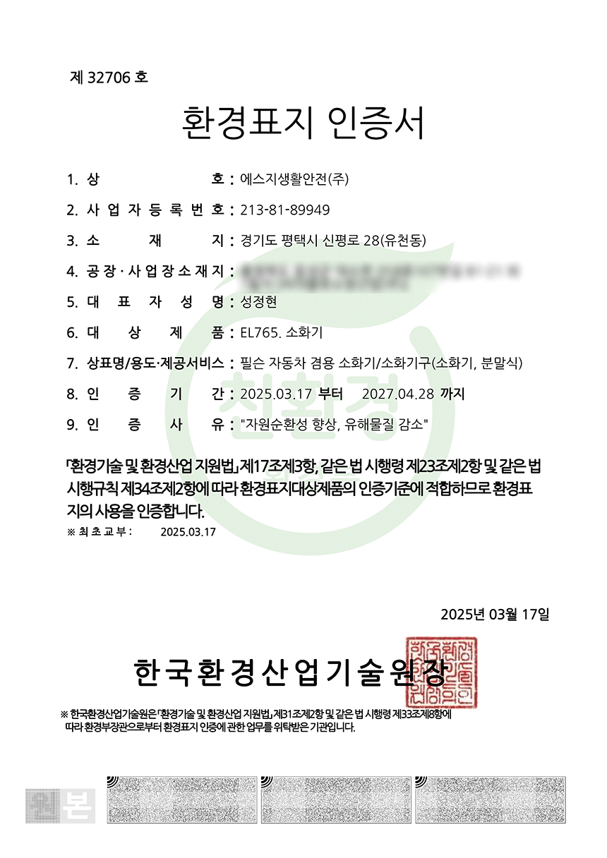 2025년 3월, 소화약제 분말에 대해 친환경 인증을 추가로 획득하였습니다.