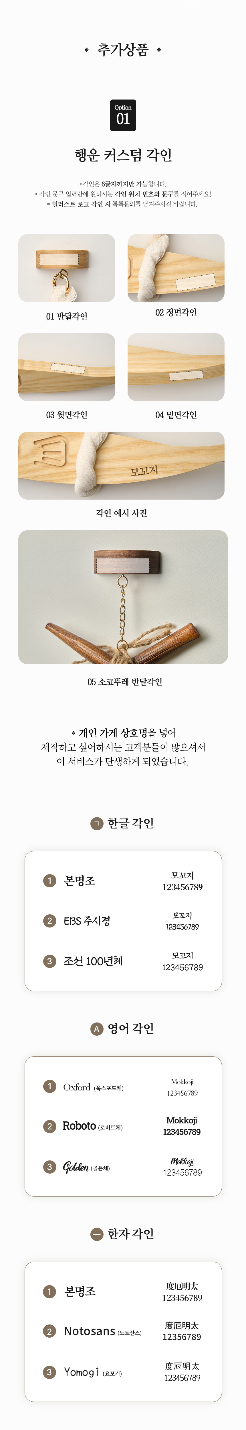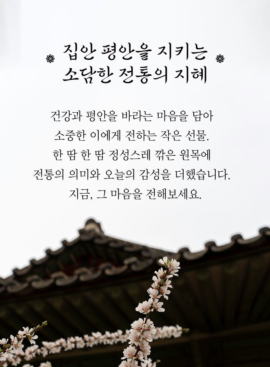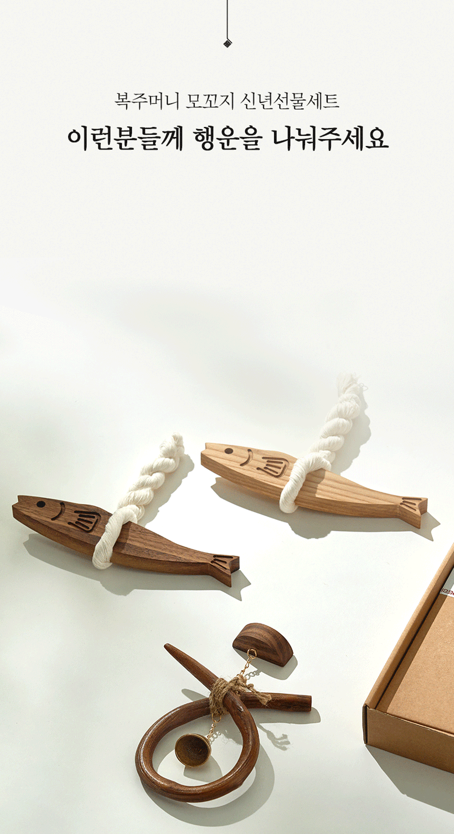 원물로 실내에 걸기 부담스러운 명태 대신 원목을 이용하여 현대 거주 환경에 어울리는 따뜻하고 귀여운 명태 모양을 제작했습니다. 하지만 명태의 특징을 살려 불운이 오는것을 감시하는 눈과 액운을 먹어버리는 입을 더 크게 만들었습니다. 명태를 매달은 촘촘한 명주실과 떨어지지않는 강한 자석 지지대는 서포터님의 공간에 행운이 오래 이어지기를 바라는 마음으로 준비했습니다.