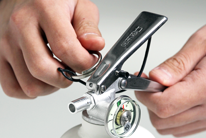 1. 소화기의 안전핀을 잡아당겨 제거해줍니다.
