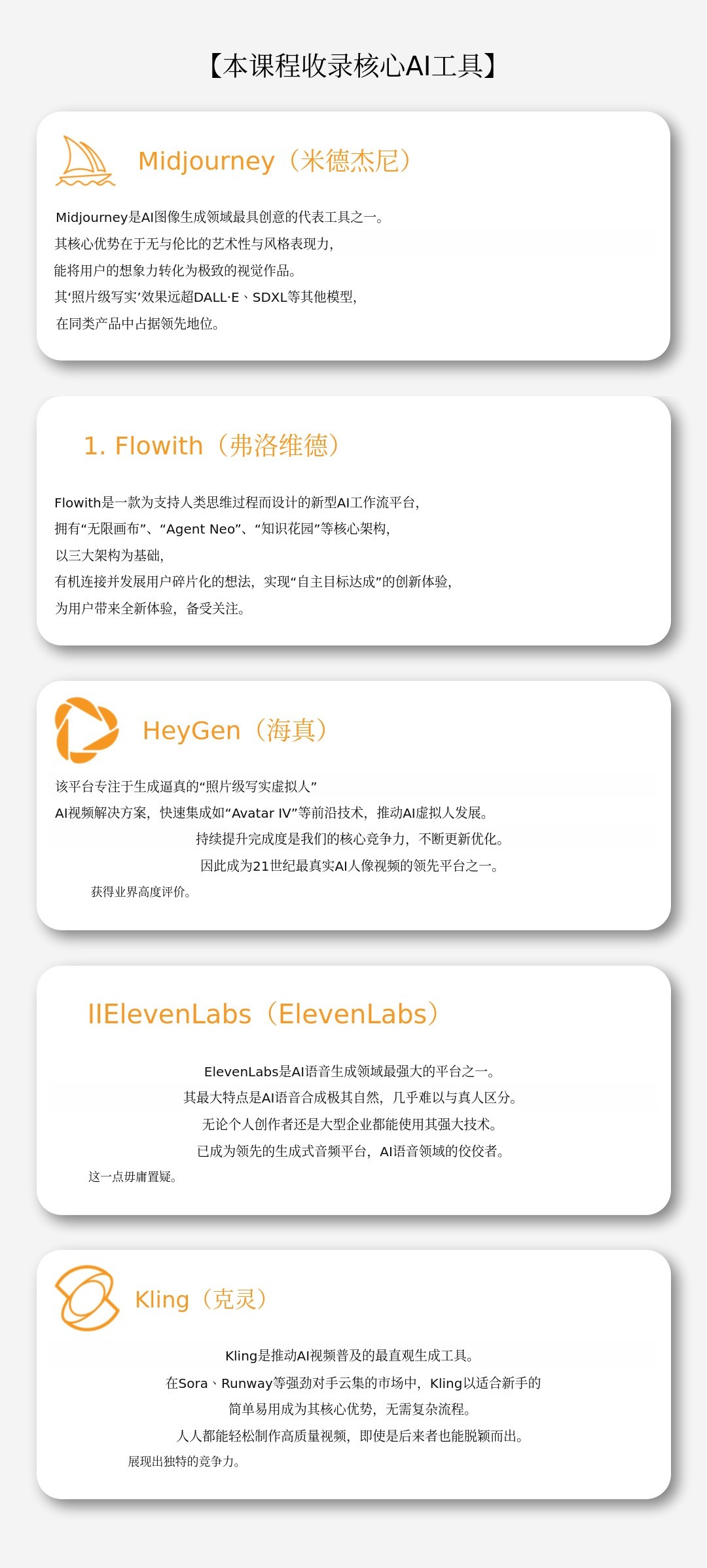 AI视频制作的核心在于不被单一工具所束缚,成为能够协调多种AI工具的‘指挥者’ 在本课程中,将学习如下整合的工作流程。