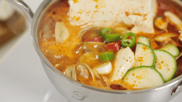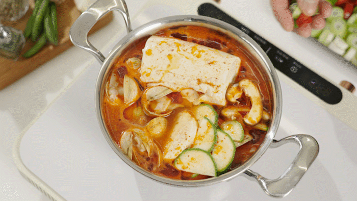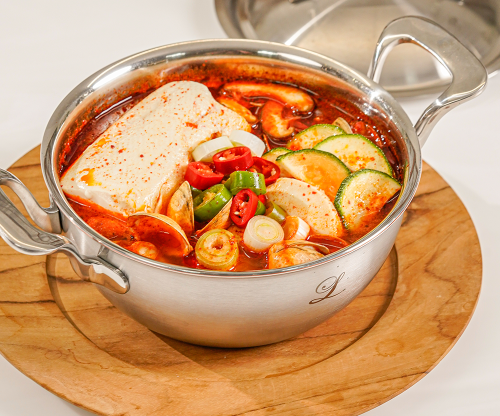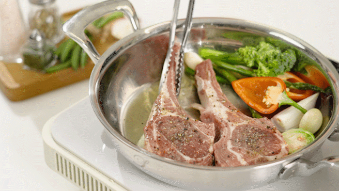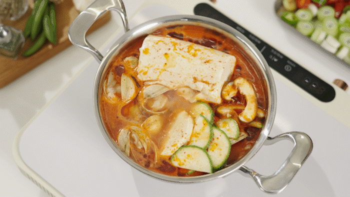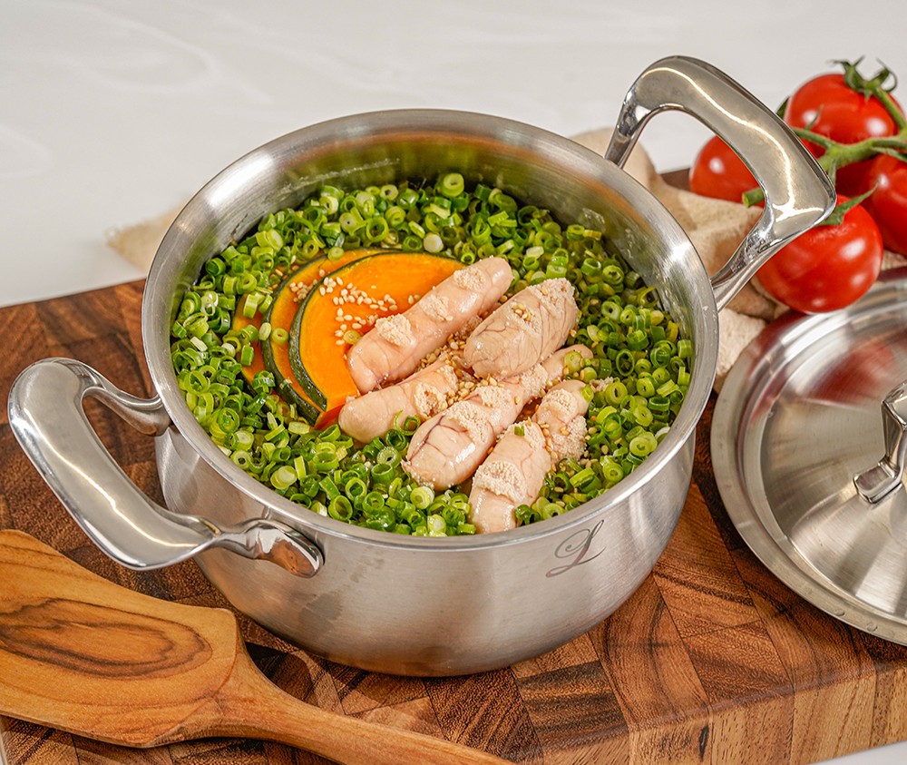 如果说刚才还是烹饪用的锅,放到餐桌上的瞬间就变成了一个高级的餐具。由于铜芯的特性,即使用小火也能长时间保持热度, 因此,仅用保温火也能享受长时间不冷的美食。