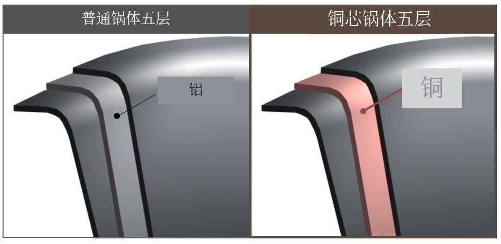 与普通不锈钢不同,在不锈钢和铝之间夹有“铜材质”,这就是铜芯的意思。铜芯是在不锈钢中间夹入铜材质,