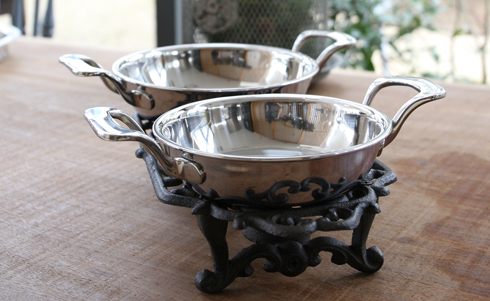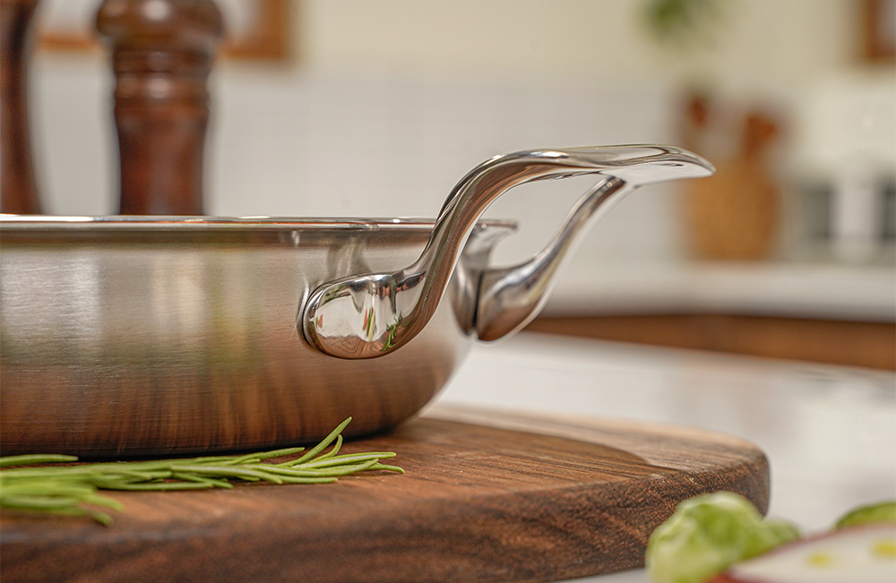 使用铜芯的人都能感受到的厚重手感。为了让这种重量感不再成为负担,所有设计都采用了双耳型,减轻手腕负担,成为更常用的烹饪工具。