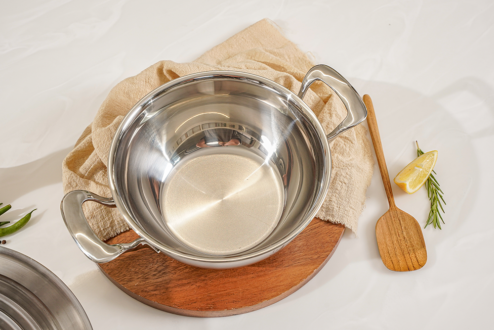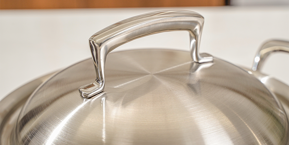 不锈钢304高级2.5T全五层结构- V型Stay Cool铸造手柄- 内外高光处理- 外部为不锈钢430,可用于电磁炉、烤箱、洗碗机。