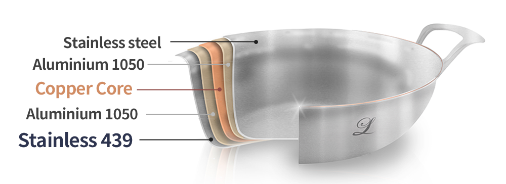 一般不锈钢锅或平底锅底部通常使用磁性较高的sus 430材料以提高电磁炉识别率。但卢瓦尔铜芯并未使用SUS430,而是采用了439材料。