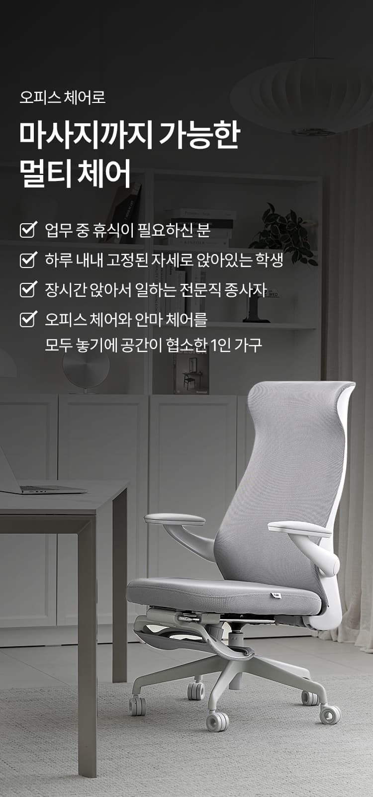 1. 💺 按摩功能办公椅 - 工作中舒缓疲劳,提供舒适按摩 2. 🛋️ 人体工学多功能椅 - 长时间坐姿依然舒适休息 3. 🎁 优惠价格与免费配送 - 灰色和黑色特价745,000韩元