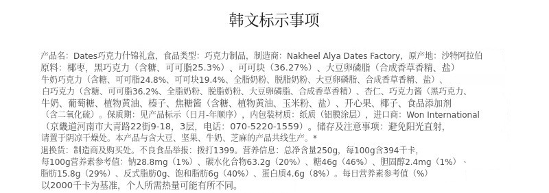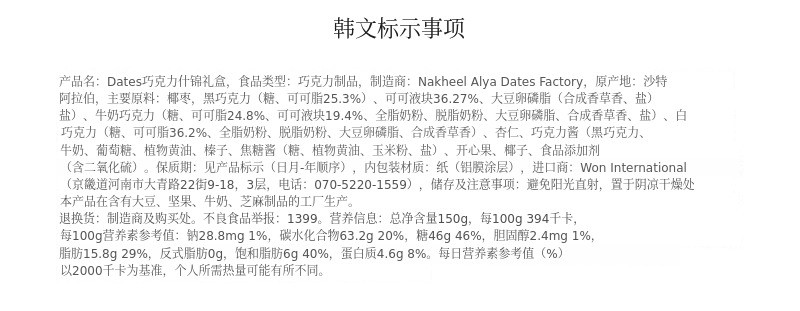 本产品拥有政府机构供货记录及全球认证,品质值得信赖。请亲自体验浓郁巧克力中整颗杏仁与椰枣的融合,健康而优雅的甜味。敬请期待并支持!