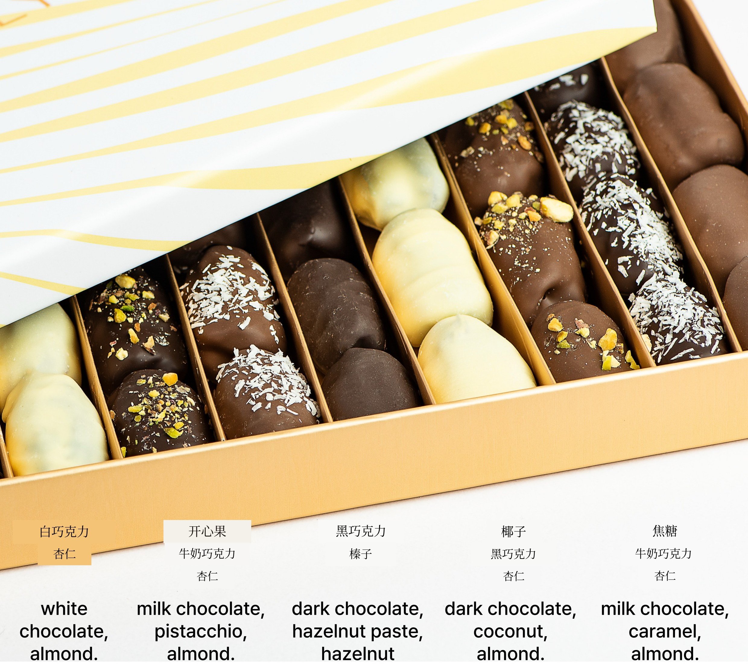 每一口都能咬到杏仁的酥脆与香气,与椰枣的甜美完美融合。外层包裹着浓郁风味的高端巧克力,为甜味增添风采。每颗巧克力还配有开心果、椰蓉、榛子等多种配料,不仅带来视觉享受,还增添了独特的风味。