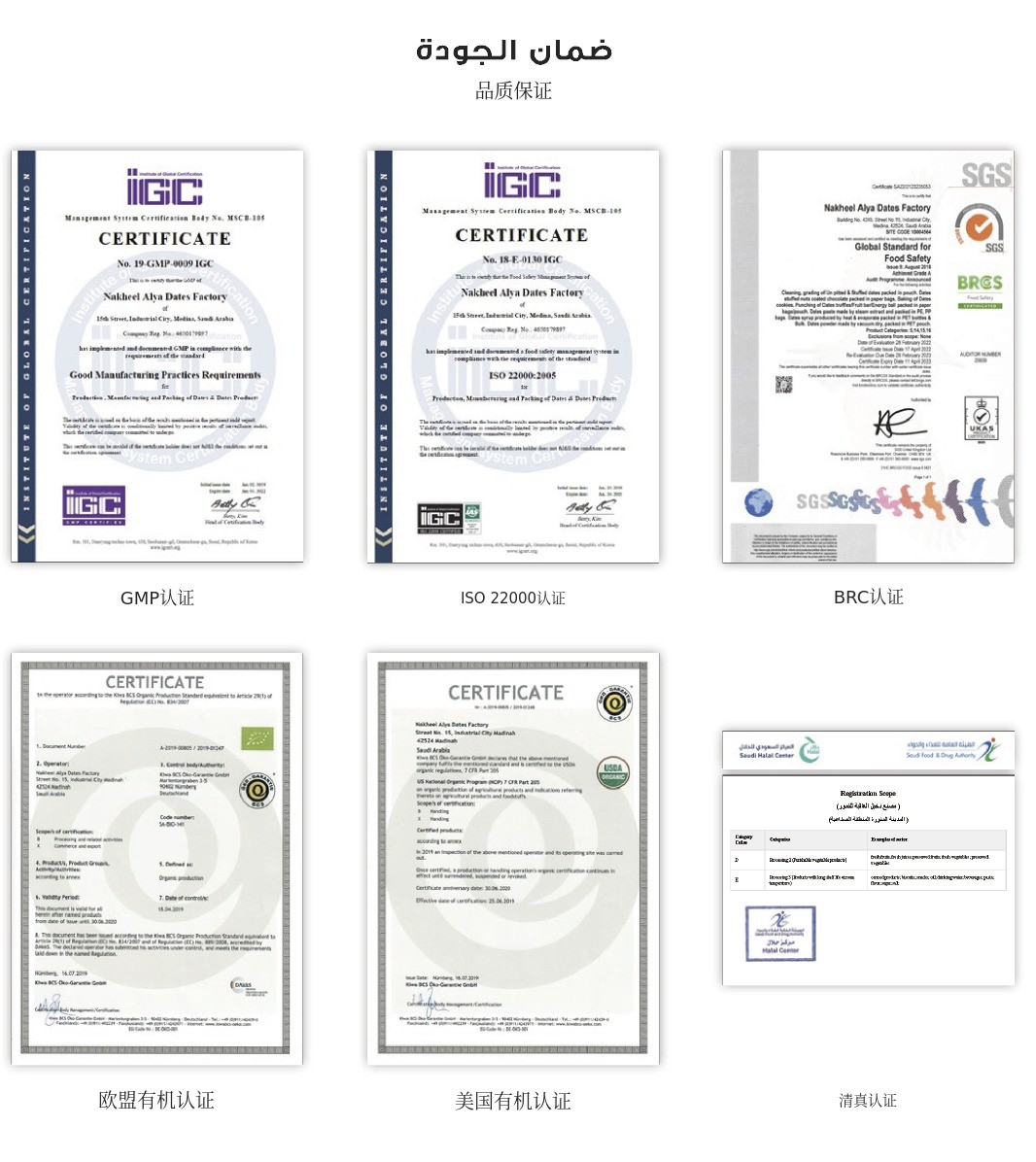获得了Saudi Made认证和Saudi Dates Mark等多项国际认证的高端品种。还拥有清真认证和BRCGS食品安全认证,品质安全可靠。通过世界认可的卫生标准和生产管理,每一颗都蕴含着健康的甜美。