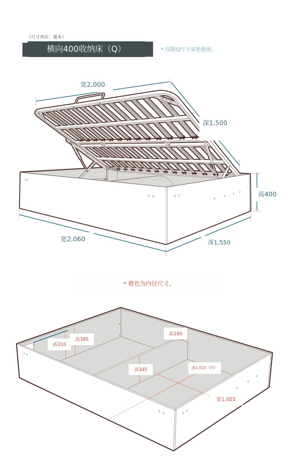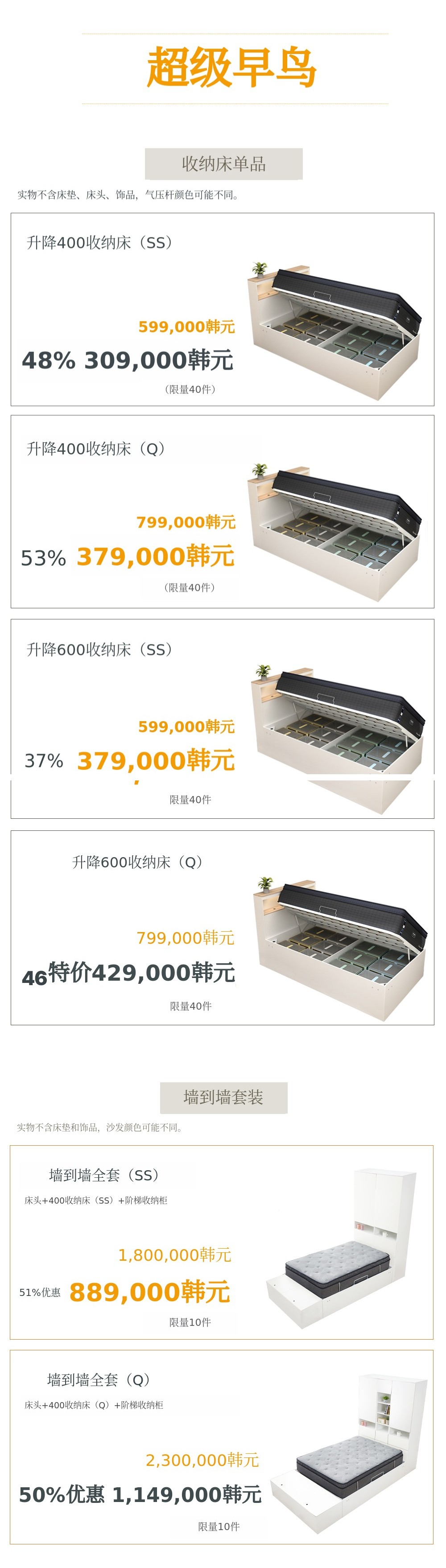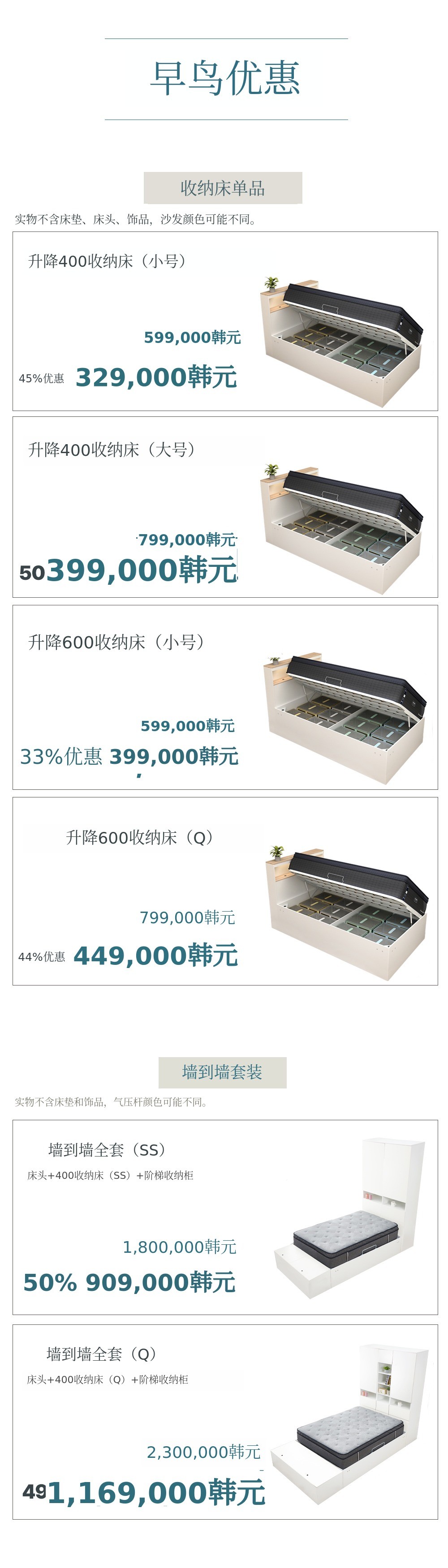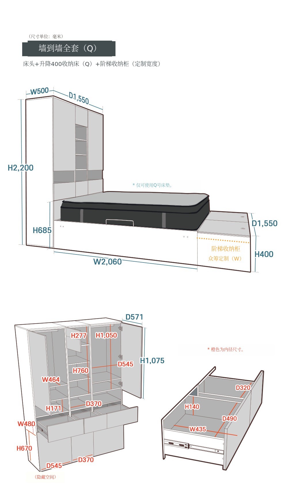 - 构成:Wall to Wall 套装(床头+横向升降400收纳床+阶梯收纳柜)