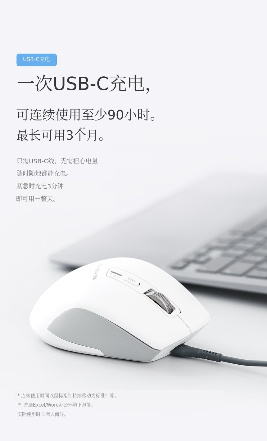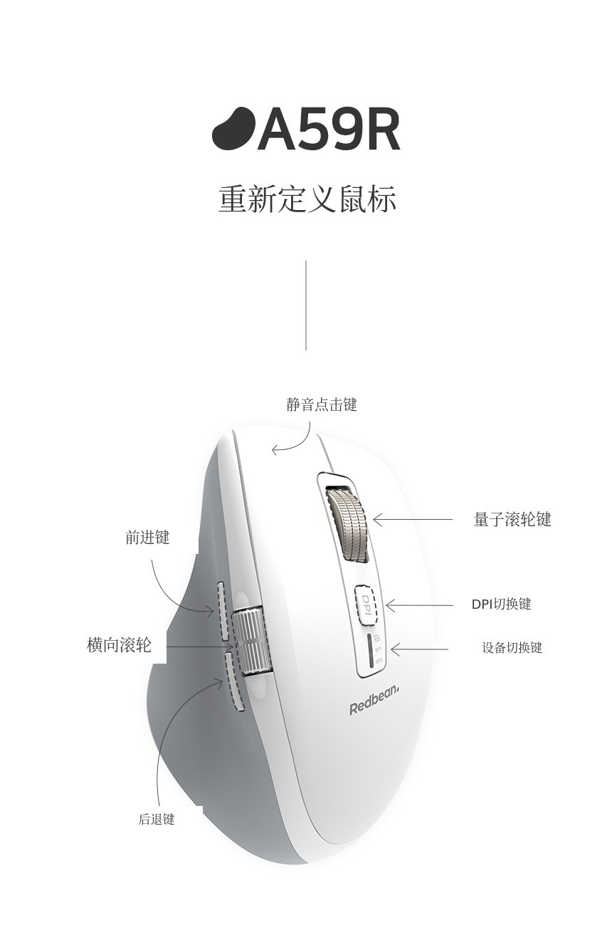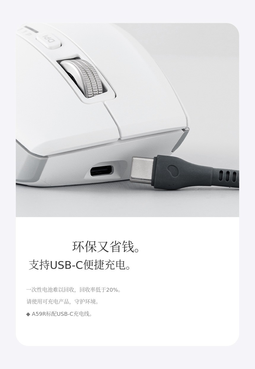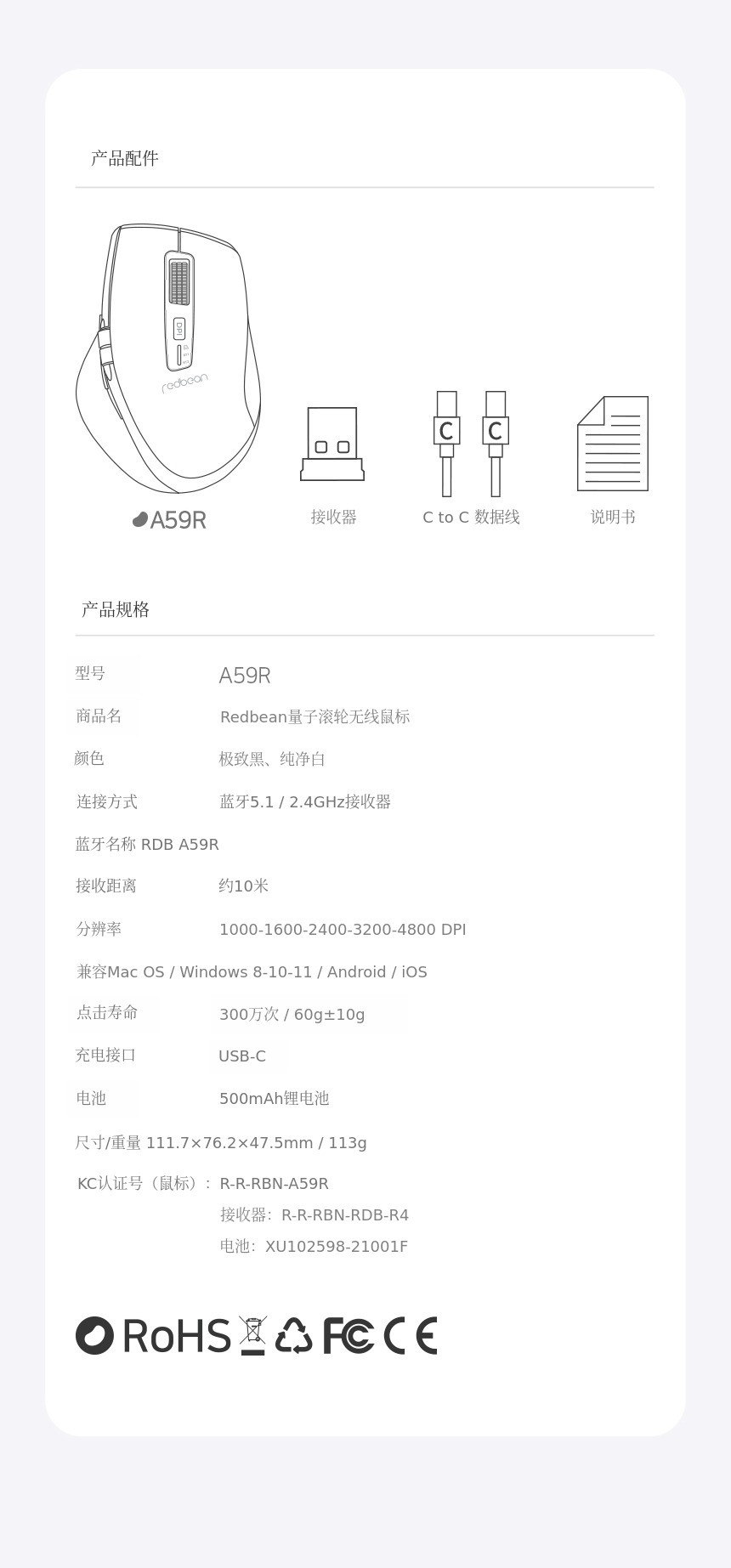鼠标底部设计了可存放经常丢失的接收器,C型充电线采用高档硅胶材质,并刻有Redbean标志,减少频繁故障,使用方便且设计高端。