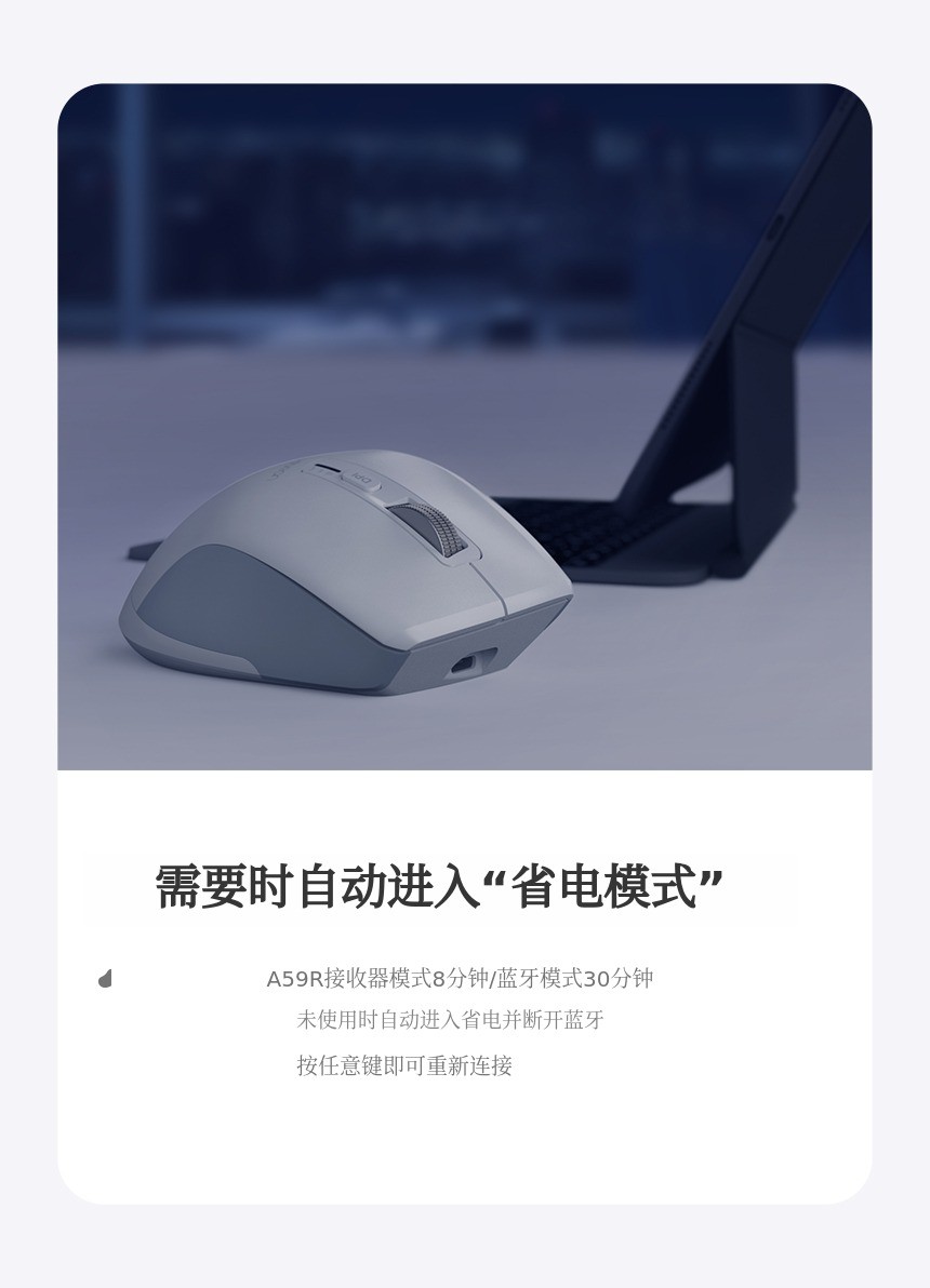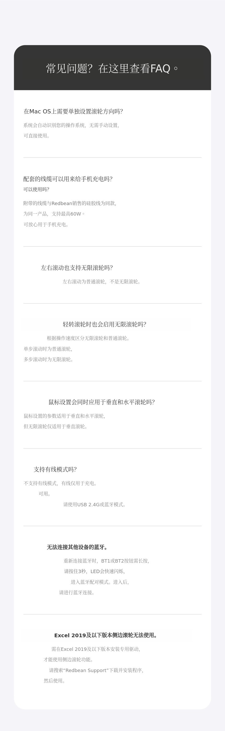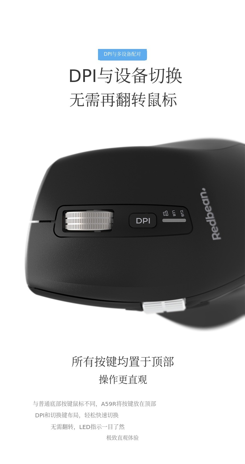 鼠标底部设计了可存放经常丢失的接收器,C型充电线采用高档硅胶材质,并刻有Redbean标志,减少频繁故障,使用方便且设计高端。