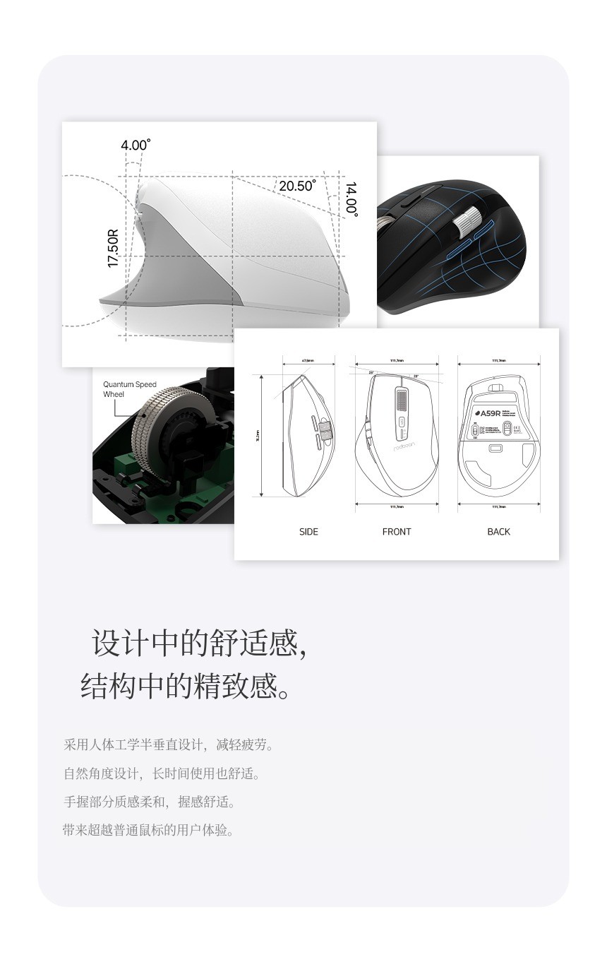 如果垂直鼠标用起来不方便,普通鼠标又让手腕疼痛,这次的无限滚动鼠标采用了“半垂直设计”。即使长时间使用,对手腕的负担也很小,能感受到贴合手掌的舒适握感。