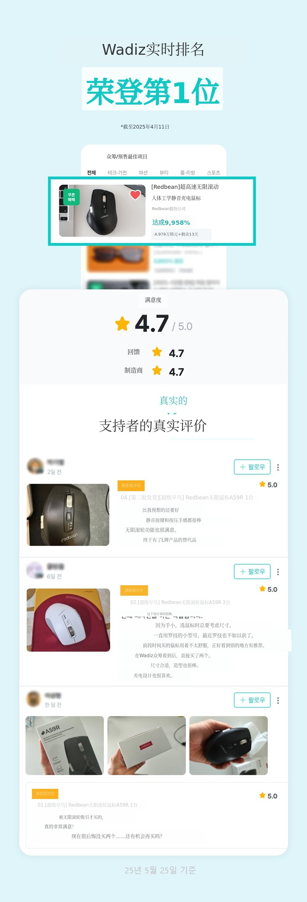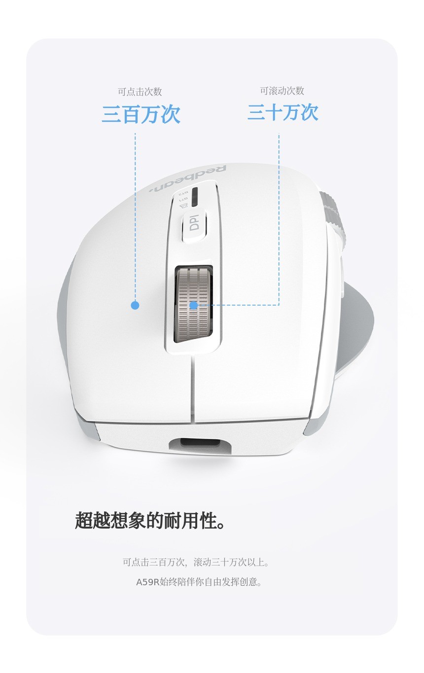 为了让您长时间舒适地使用。可点击次数高达300万次,滚轮可达30万次。因为是值得信赖的Redbean才做得到。凭借坚固的耐用性,让好鼠标用得更久。