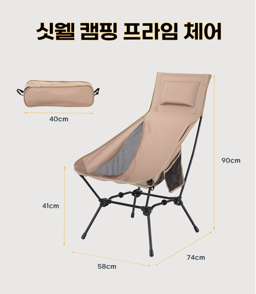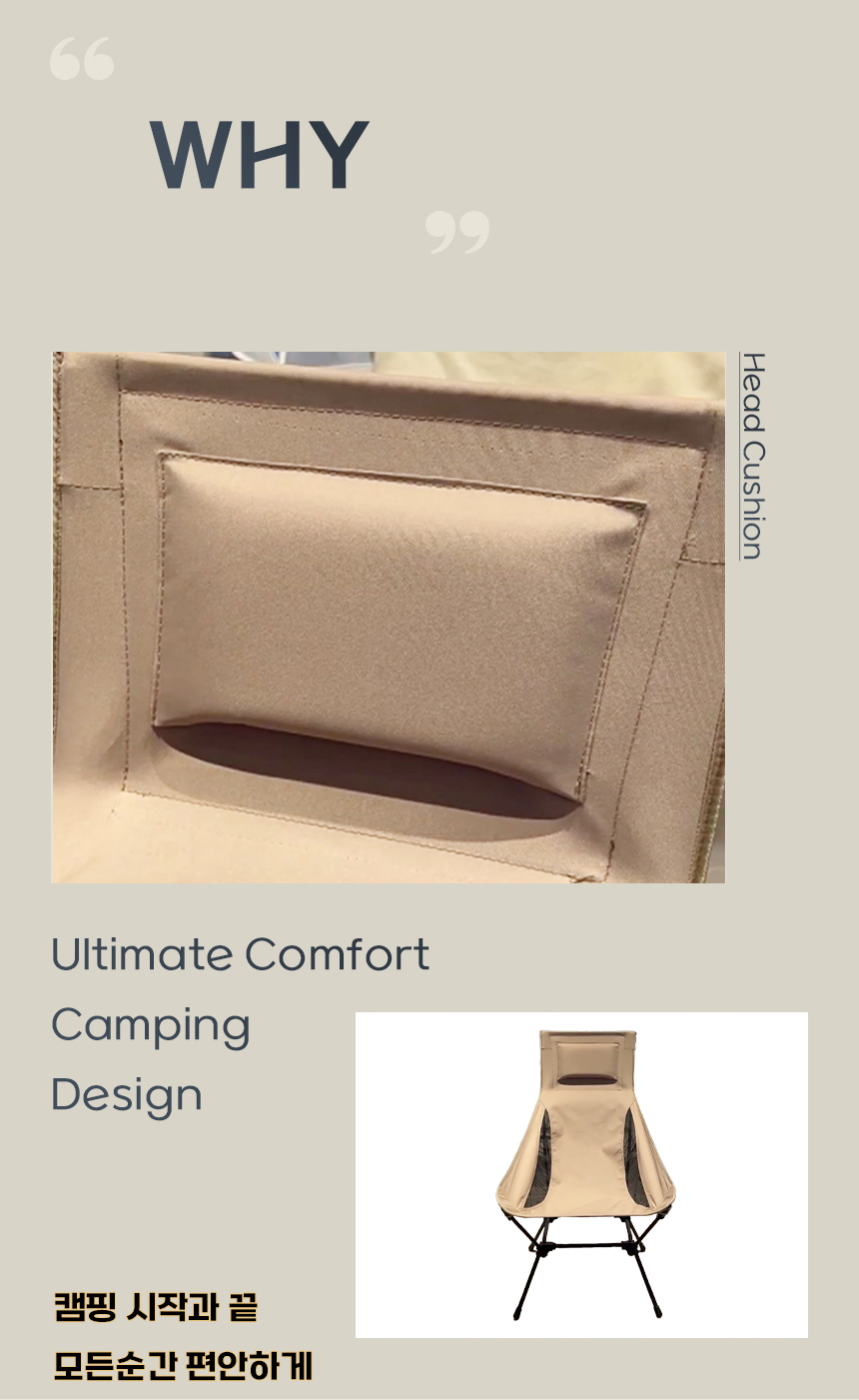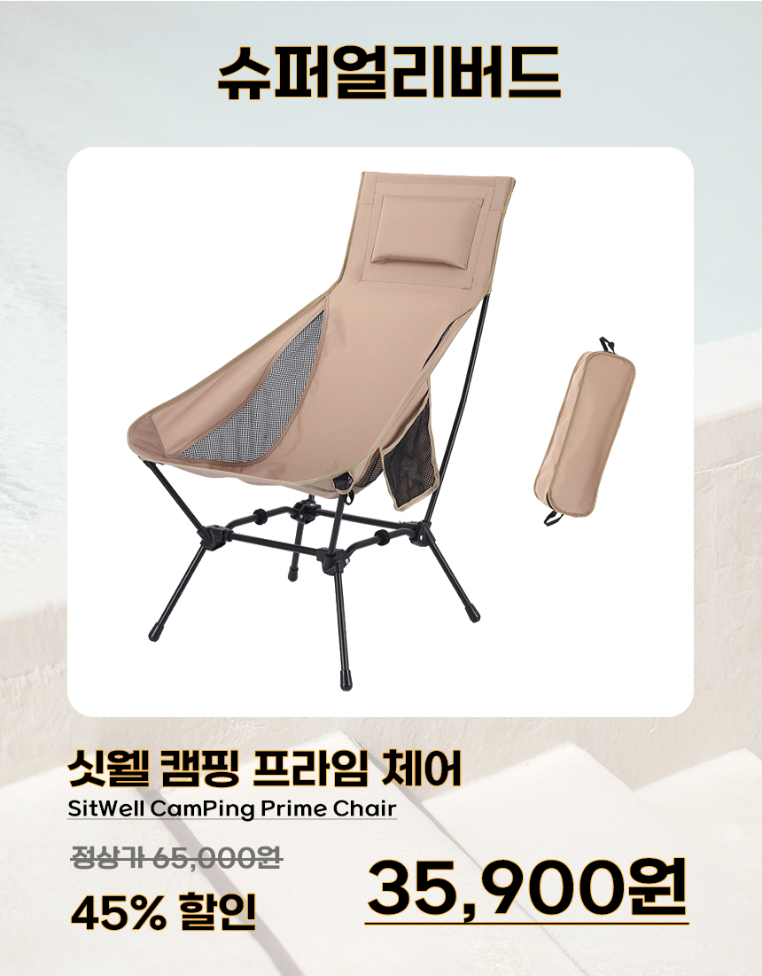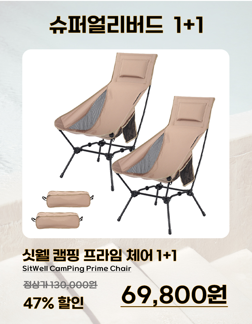 캠핑이나 야외활동을 할 때 장시간 앉아 있으면 목이나 등이 불편해지는 경우가 많습니다. 이전에 런칭한 캠핑의자는 등받이가 짧아 머리를 기대기 어렵고, 목을 지탱할 수 있는 구조가 부족합니다. 이를 개선하여 새롭게 제작한 싯웰 캠핑 프라임 체어는 등받이와 헤드쿠션을 추가 개선하여 와디즈 서포터님께서 허리 아픈 의자가 아닌 휴대성과 편안함을 모두 챙긴 싯웰 캠핑 프라임 체어를 런칭하게 되었습니다.