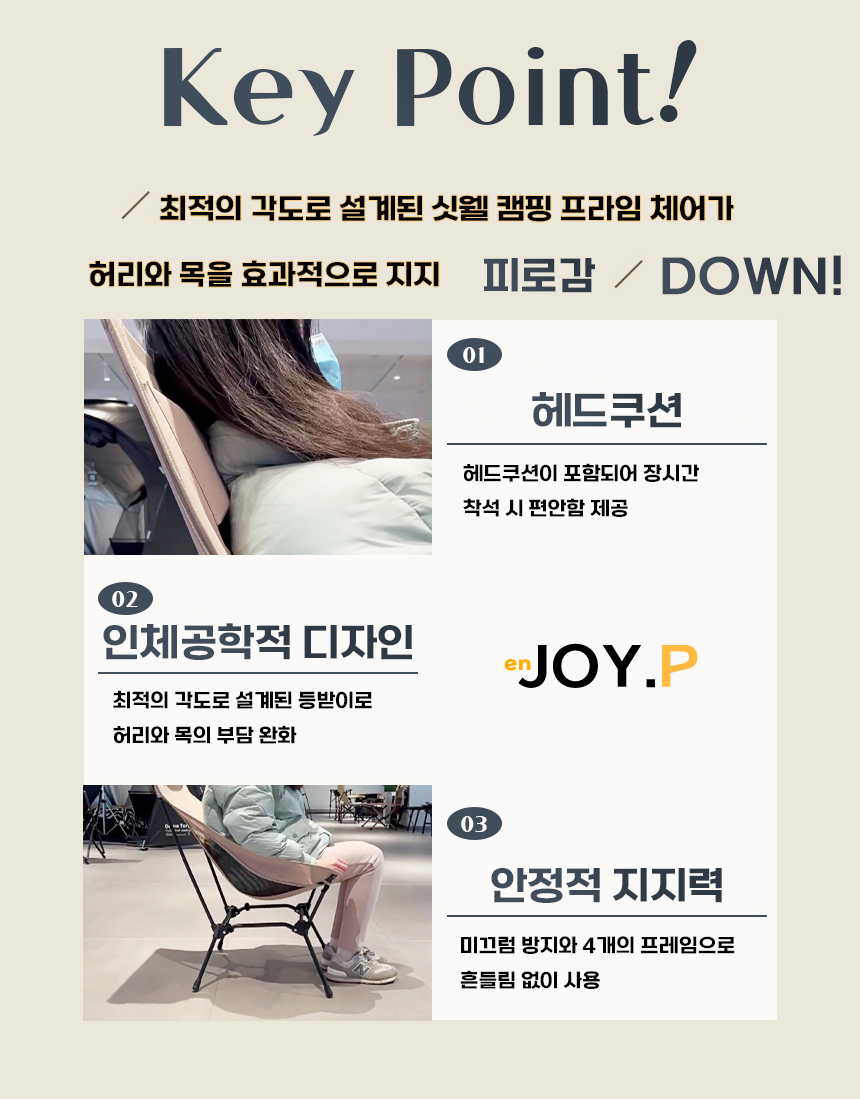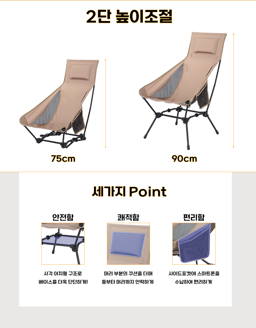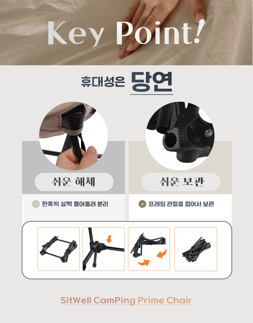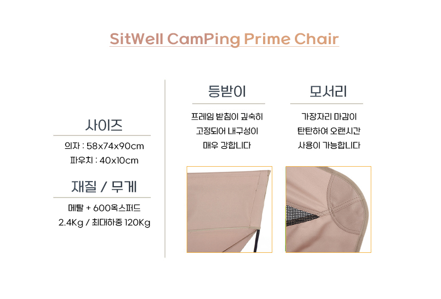 캠핑이나 야외활동을 할 때 장시간 앉아 있으면 목이나 등이 불편해지는 경우가 많습니다. 이전에 런칭한 캠핑의자는 등받이가 짧아 머리를 기대기 어렵고, 목을 지탱할 수 있는 구조가 부족합니다. 이를 개선하여 새롭게 제작한 싯웰 캠핑 프라임 체어는 등받이와 헤드쿠션을 추가 개선하여 와디즈 서포터님께서 허리 아픈 의자가 아닌 휴대성과 편안함을 모두 챙긴 싯웰 캠핑 프라임 체어를 런칭하게 되었습니다.