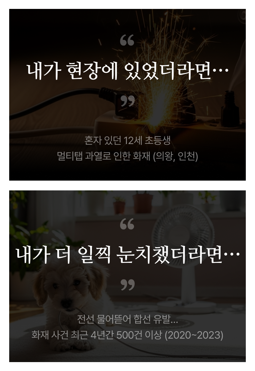 실사용자와의 긴밀한 피드백을 통해 더 나은 화재 예방 솔루션으로 발전시키기 위해, 그리고 우리가 모르는 사이 피어오르는 불씨를 함께 끄기 위해 이 자리에 왔습니다. 많은 응원을 부탁드립니다. 감사합니다!