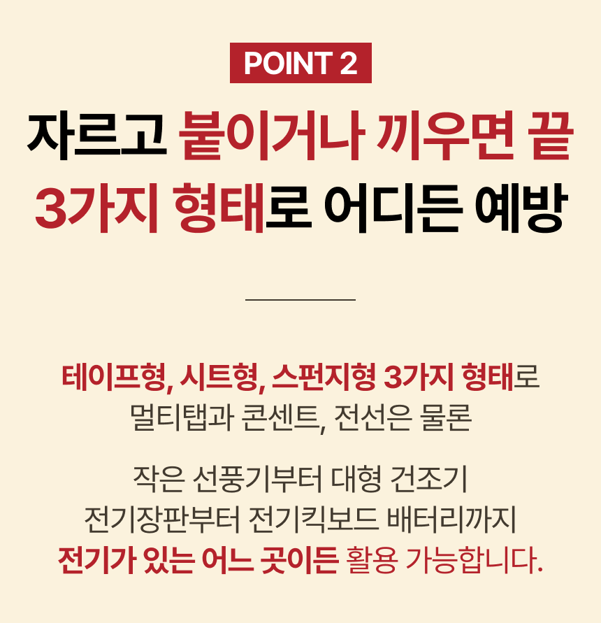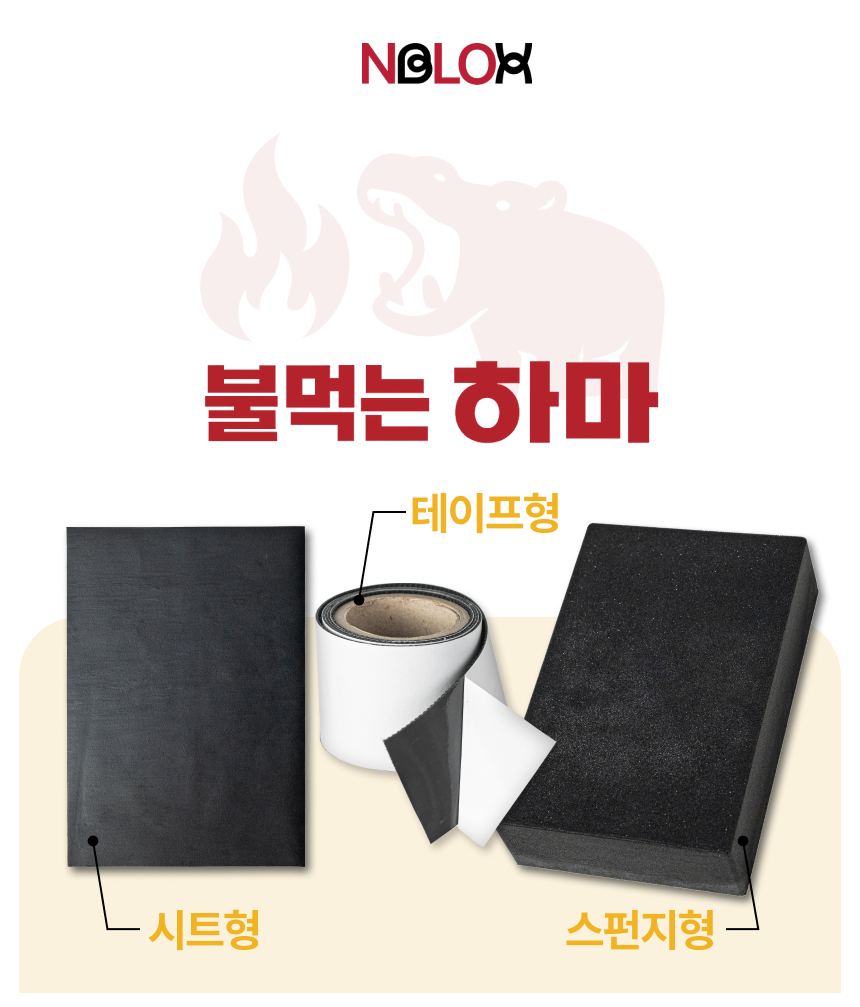 테이프, 시트, 스펀지 모두 일회성 제품이 아니며, 떼어내지 않는 이상 오랜 시간 동안 그 자리를 지키며 불을 예방합니다.