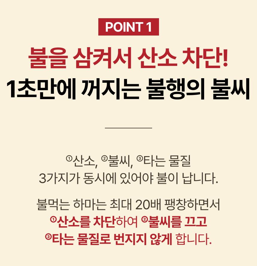 얇지만 강하고, 작지만 넓어지는 이 소재 덕분에 초기 불씨를 감싸고, 퍼지지 않게 막을 수 있어요. 불길을 자기 몸으로 끌어안고 꺼버립니다.