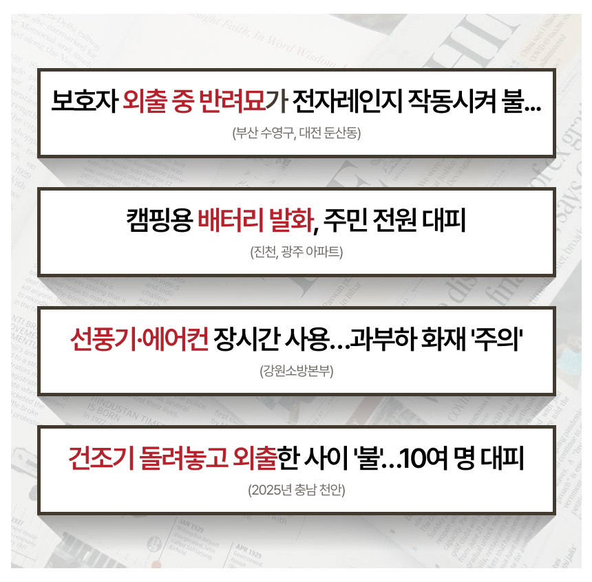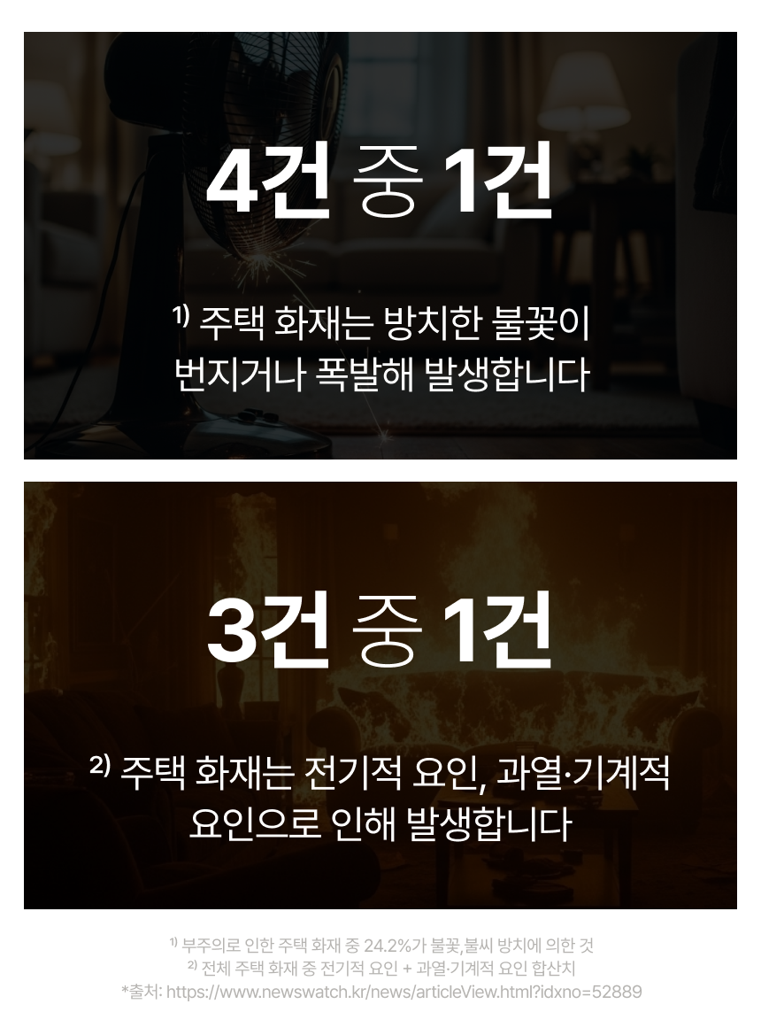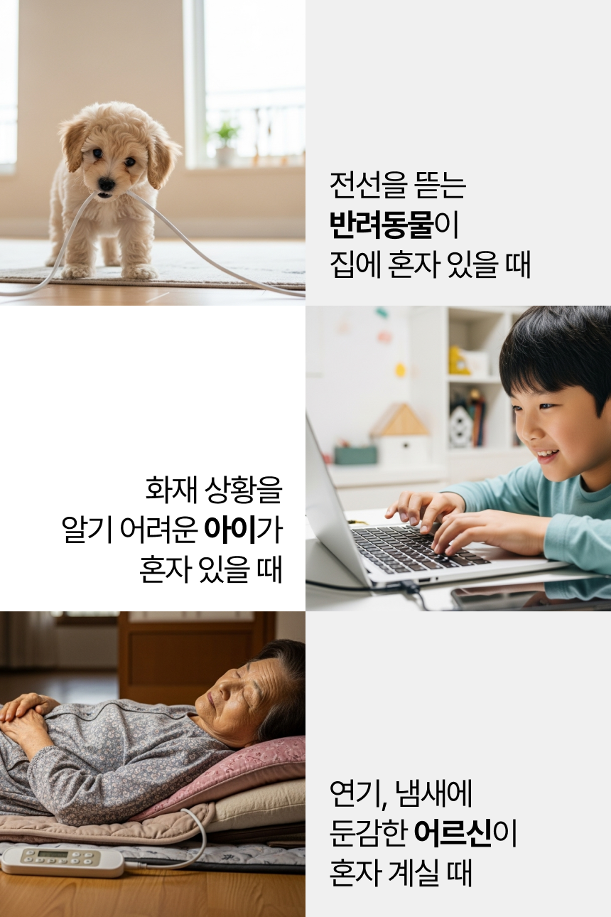 우리는 대부분 화재가 “설마 나한텐 안 일어나겠지”라고 생각합니다. 하지만 많은 화재 사고는 집을 비운 사이, 아이와 반려동물이 혼자 있는 시간, 잠깐 한눈을 판 사이에 발생합니다.