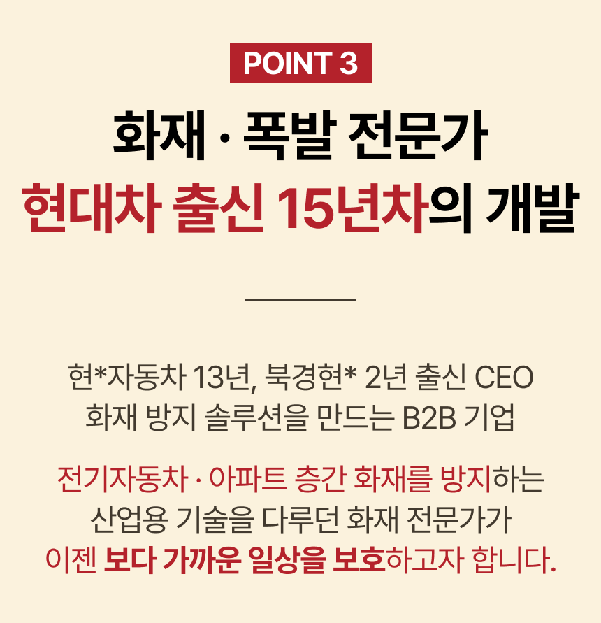 그 후 4년간의 연구개발 끝에, 화재 초기의 열과 불씨를 감지해 즉시 확산을 차단하는 제품을 직접 개발하게 되었습니다. 항공사, 자동차 부품사, 배터리 기업 등과의 테스트를 통해 성능을 검증받았고, 이제는 가정과 일상에서도 사용할 수 있도록 제품을 확장하게 되었습니다.