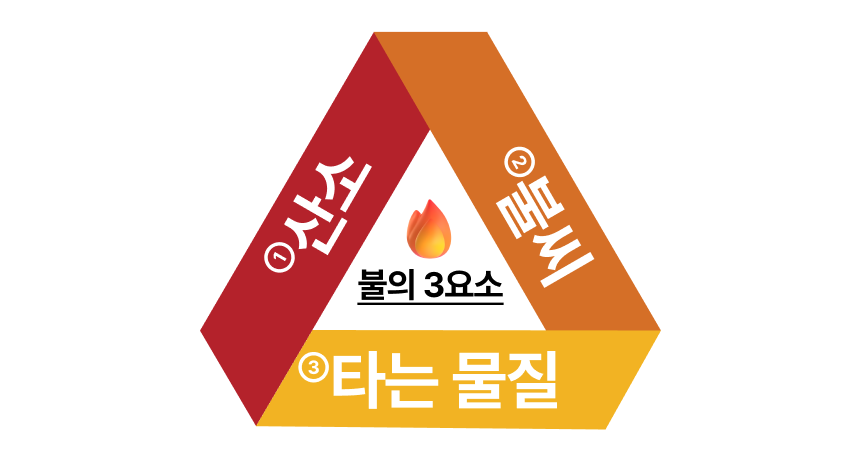 화재는 산소, 불씨, 타는 물질이 함께 있을 때 생겨요. 하나라도 없으면 불이 시작되지 않습니다.