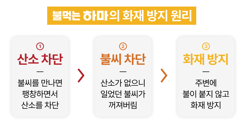 불먹는 하마는 평소엔 얇은 상태입니다. 하지만 불이 닿는 순간 알아서 부풀어 오르며 불을 막습니다.