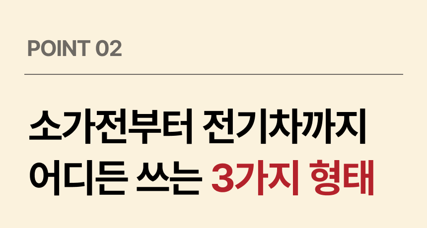- 가정용 전자기기, 배터리, 멀티탭, ESS 설비 등에 적합합니다.