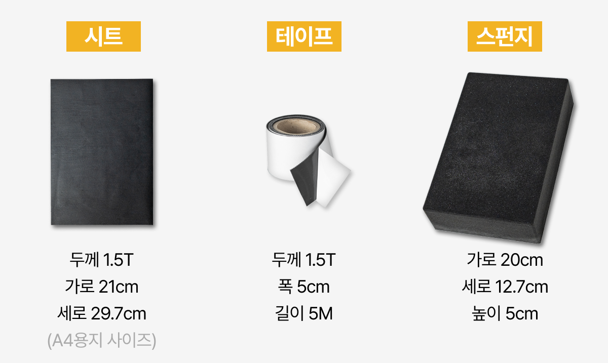 가위나 커터칼로 쉽게 자를 수 있어 적절한 크기, 모양으로 마음대로 조절이 가능해요. 게다가 스펀지는 다른 형태들과 달리, 충격을 흡수하고 소음까지 줄여주는 기능까지 갖추었죠.