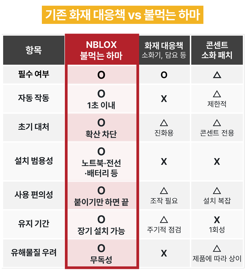하지만 NBLOX 불먹는 하마는 아예 불이 번지지 않도록 초기에 확산을 막는 제품입니다. 게다가 연기와 유해물질도 거의 발생하지 않아서, 아이와 반려동물이 있는 집에도 안심입니다.