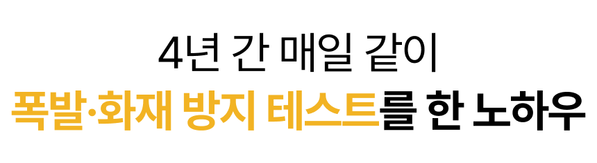 그래서 더 꼼꼼하게, 더 오래 테스트했고, 현재는 L*, 삼*, 현* 등 굵직한 배터리·자동차 기업과도 테스트 협업이 진행되고 있습니다. 항공사와 대기업이 인정하는 제품이니, 가정에서는 더할 나위 없이 든든하다고 자부할 수 있습니다.