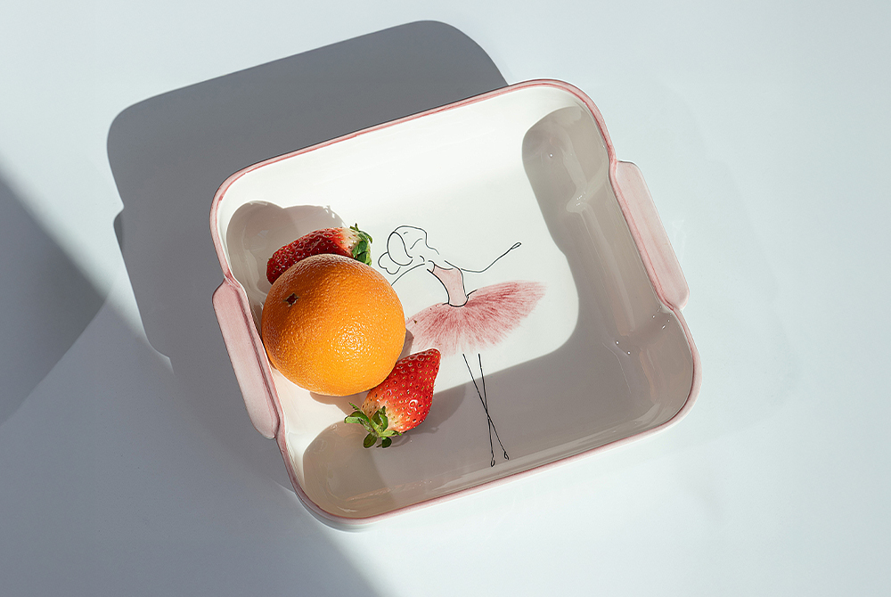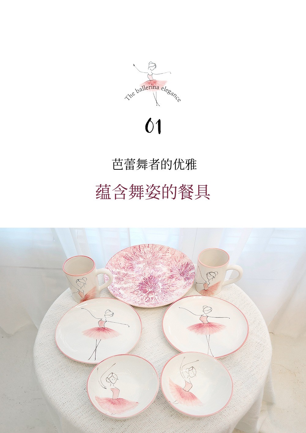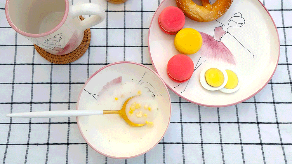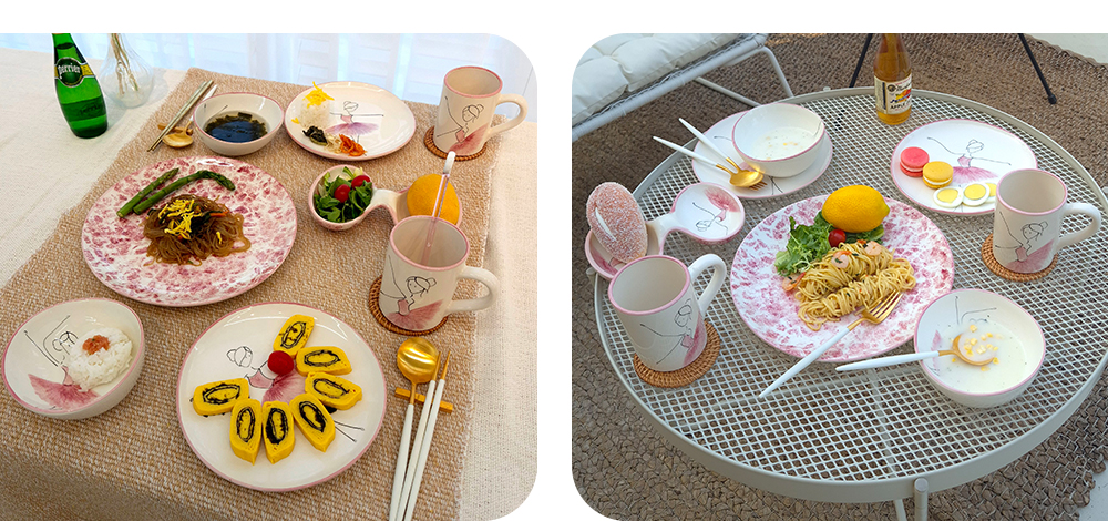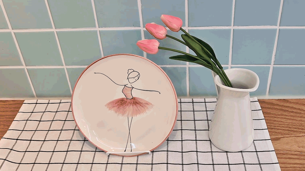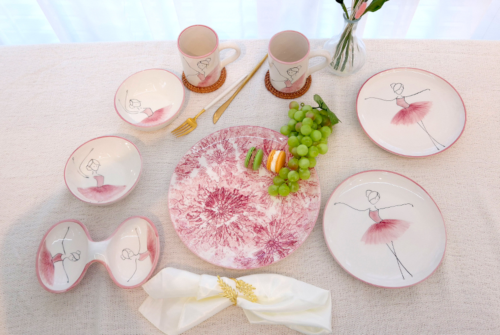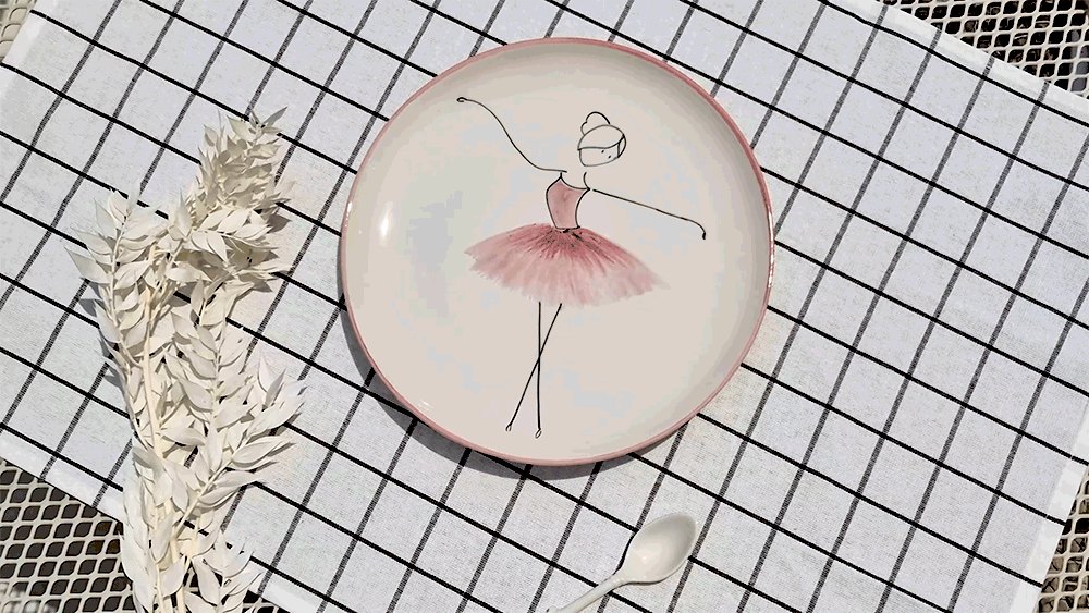 用柔和的笔触描绘的粉色蓬蓬裙让人联想到舞者细腻的动作,整体柔和的曲线与粉彩色调的和谐为餐桌增添温暖的感性。