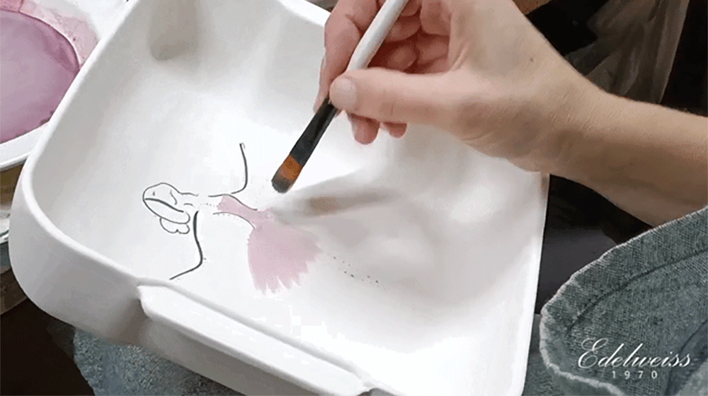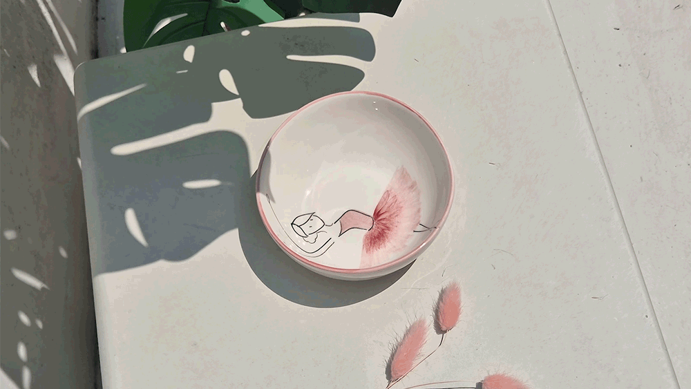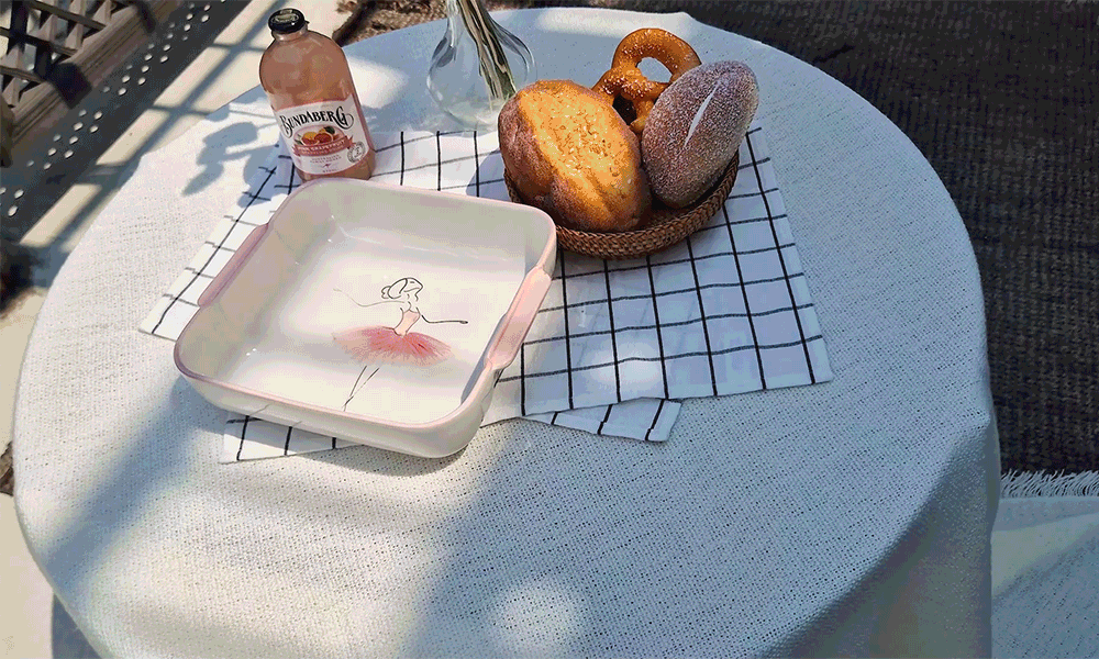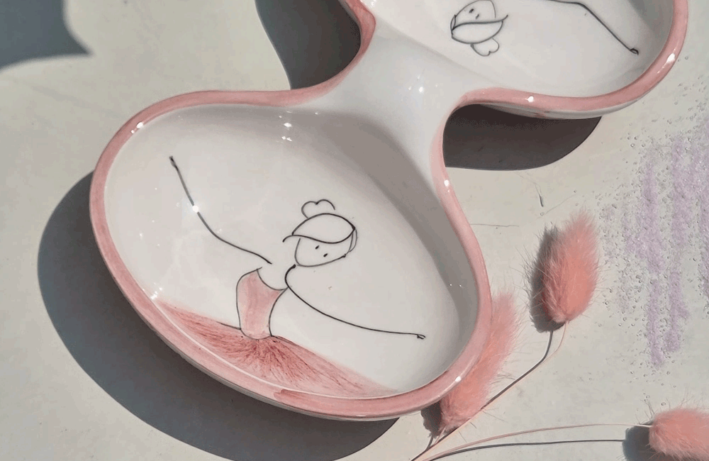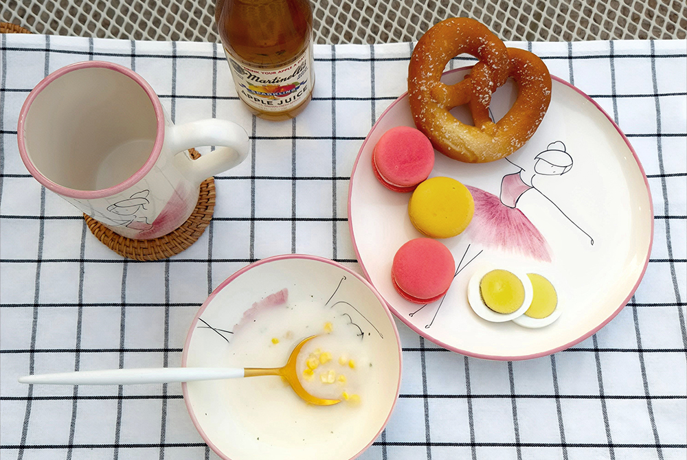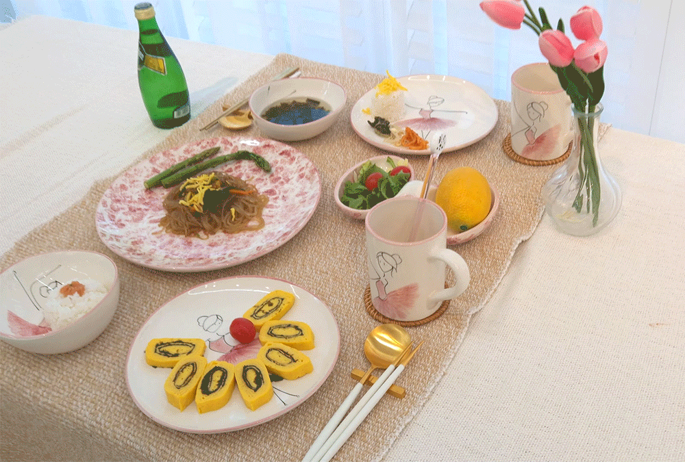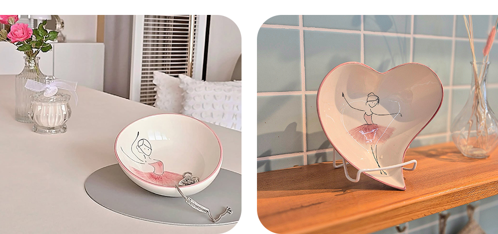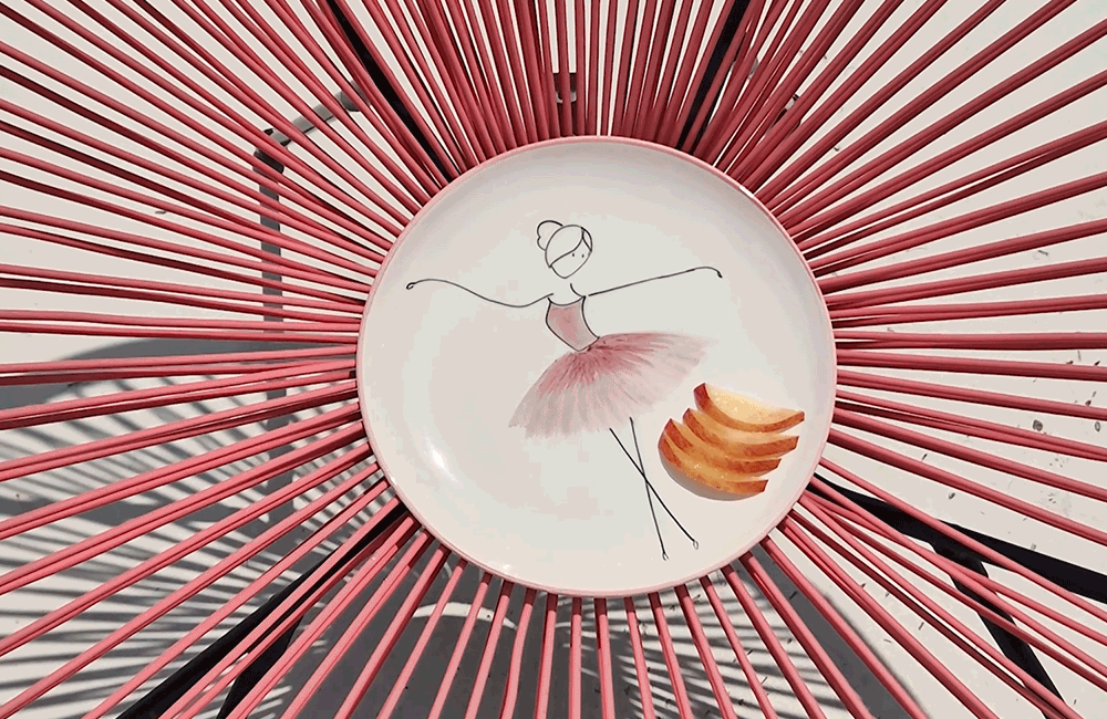 用柔和的笔触描绘的粉色蓬蓬裙让人联想到舞者细腻的动作,整体柔和的曲线与粉彩色调的和谐为餐桌增添温暖的感性。
