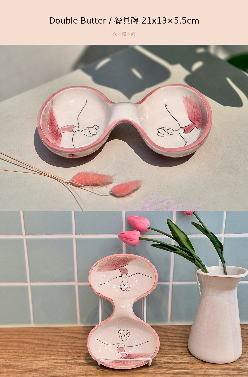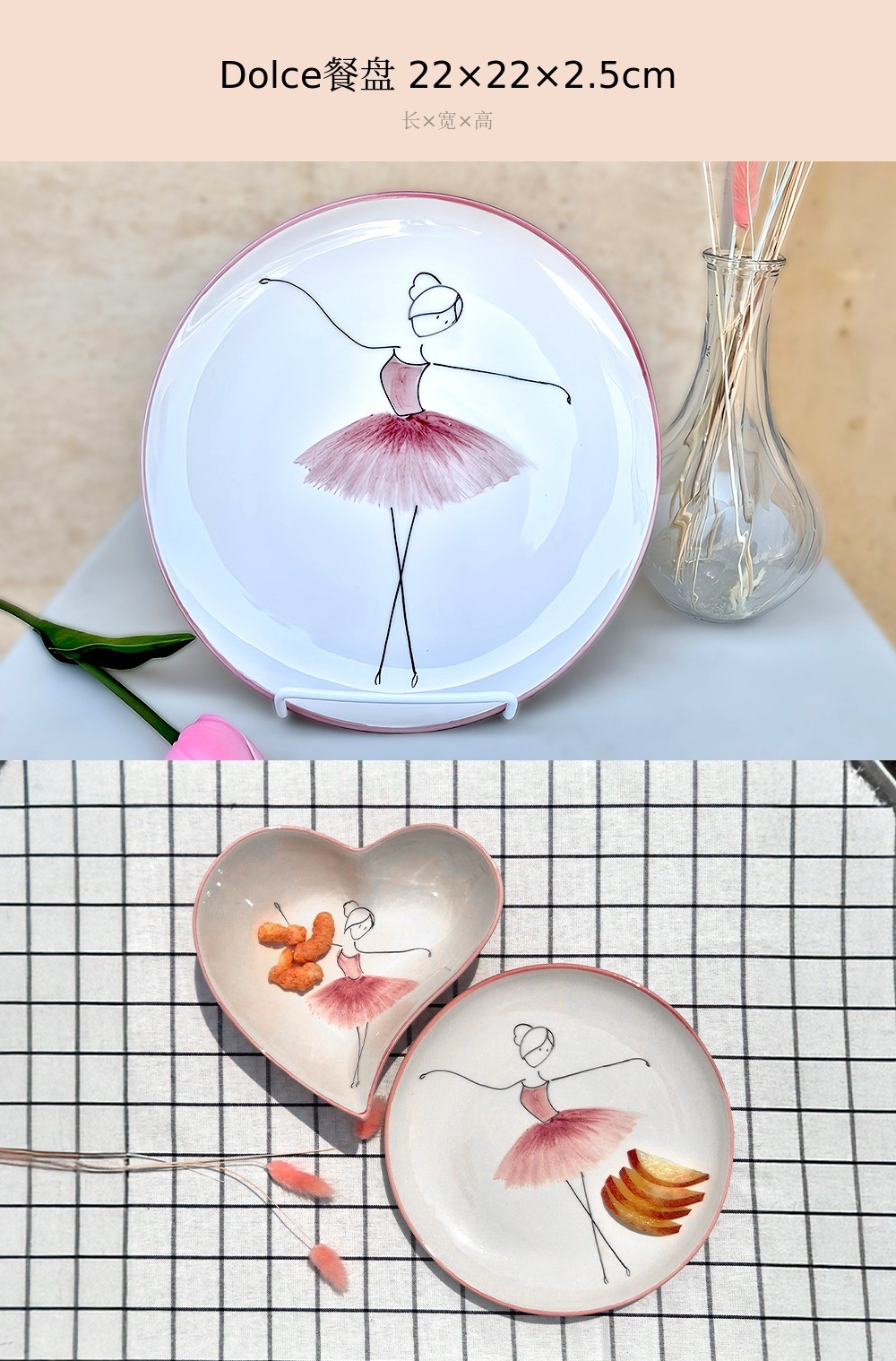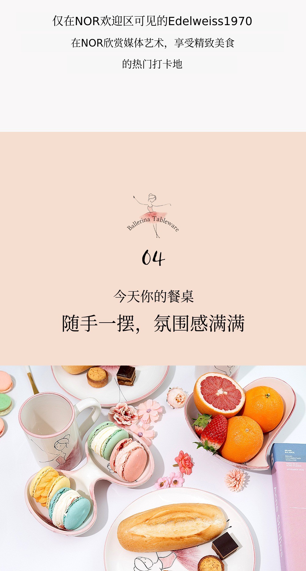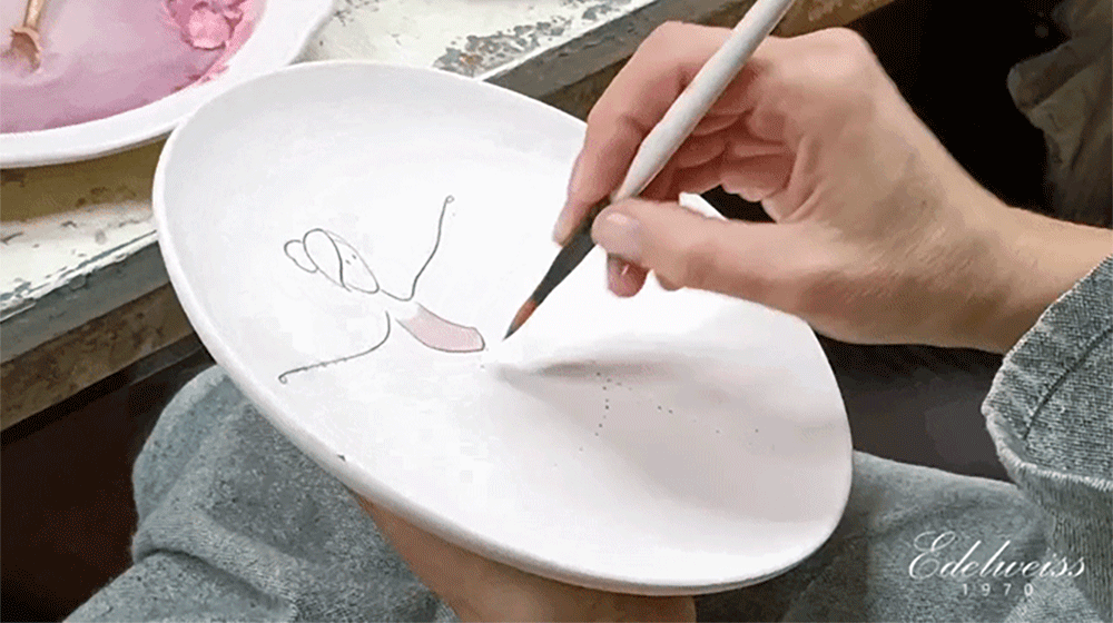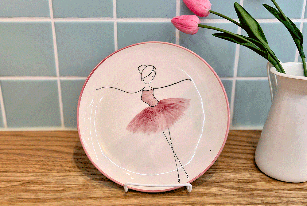 用柔和的笔触描绘的粉色蓬蓬裙让人联想到舞者细腻的动作,整体柔和的曲线与粉彩色调的和谐为餐桌增添温暖的感性。
