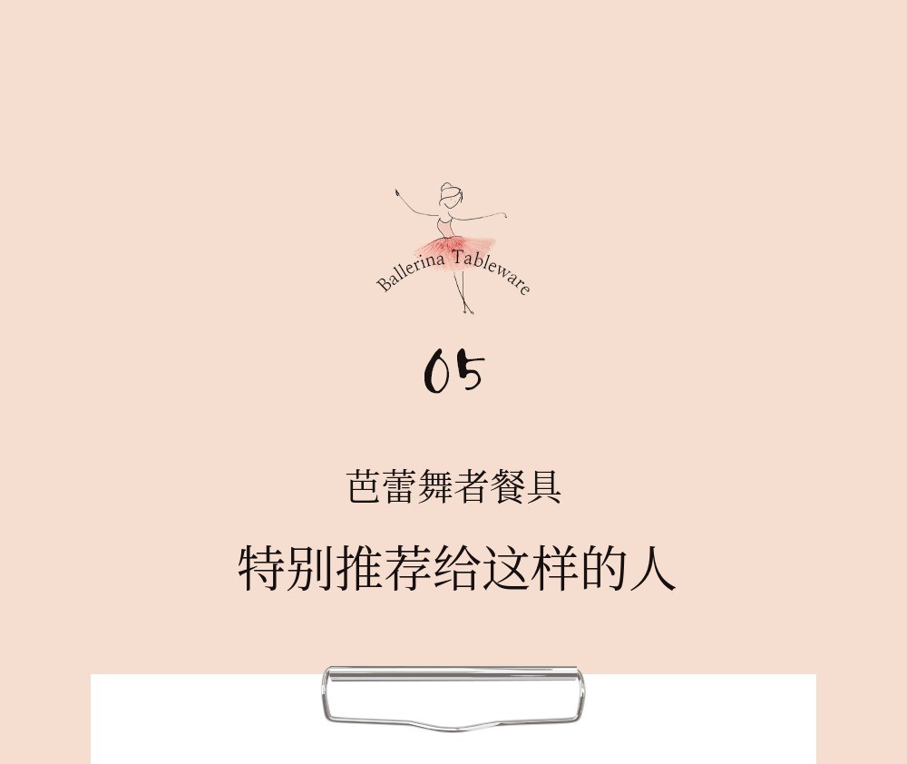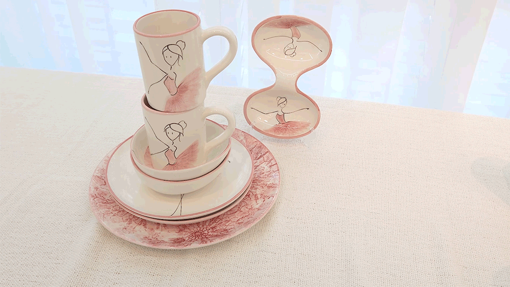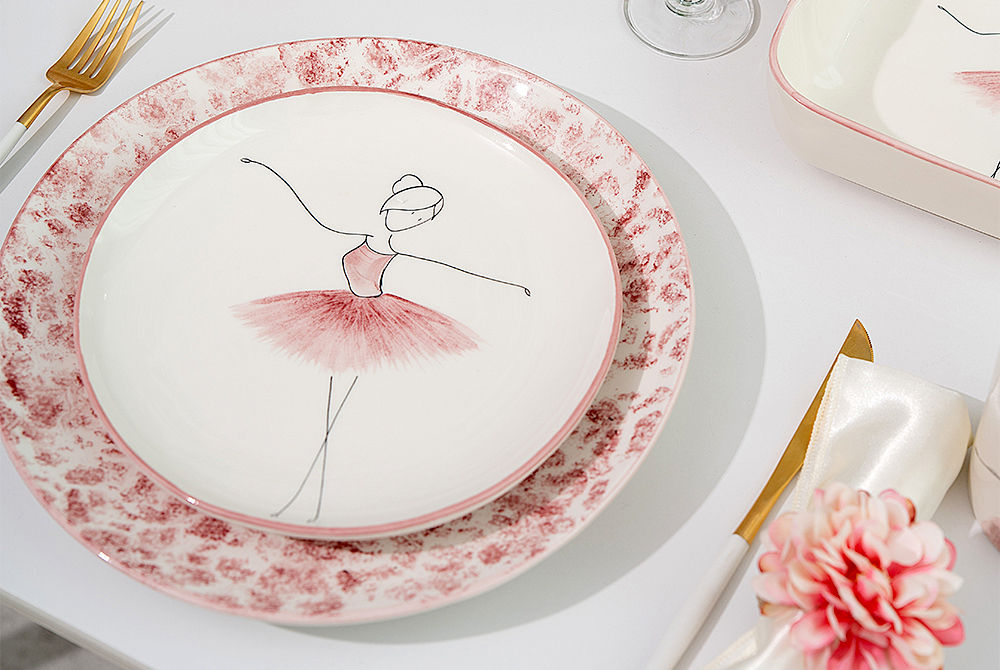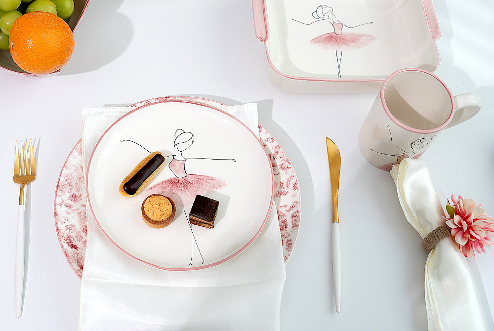 芭蕾舞者优雅的动作与餐具的圆润造型相融合,仿佛在餐具中起舞,充满生动感。