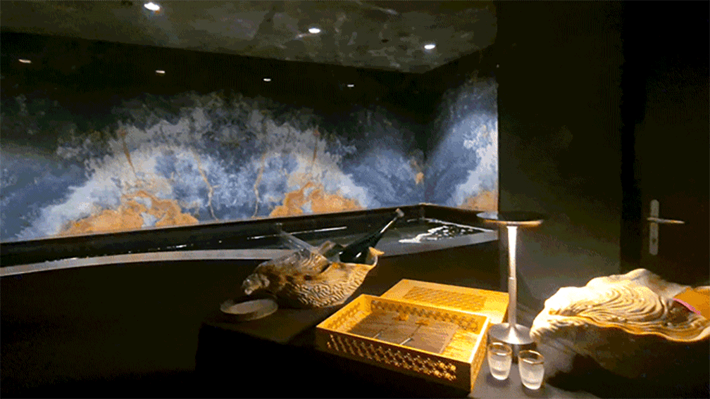如红色海绵印迹般扩散的艺术级名品质感,让日常餐桌
