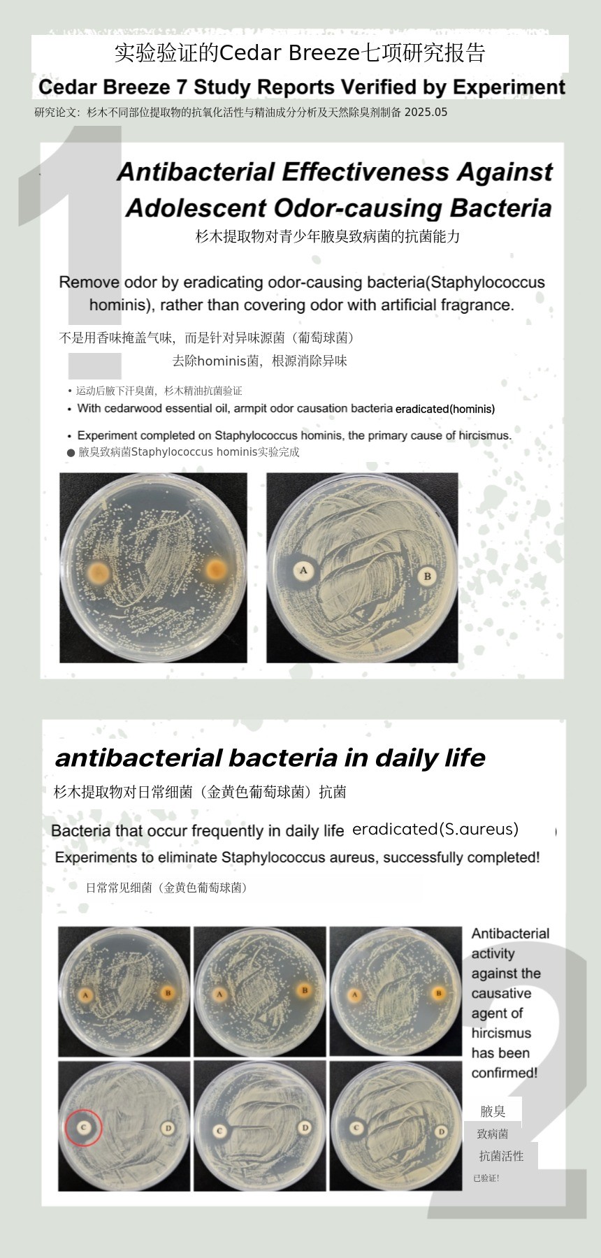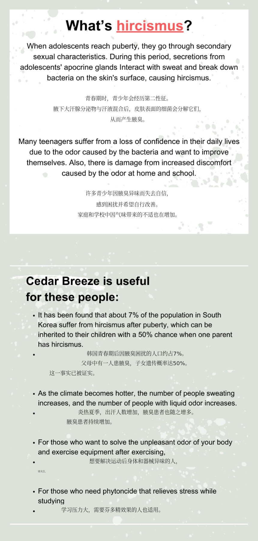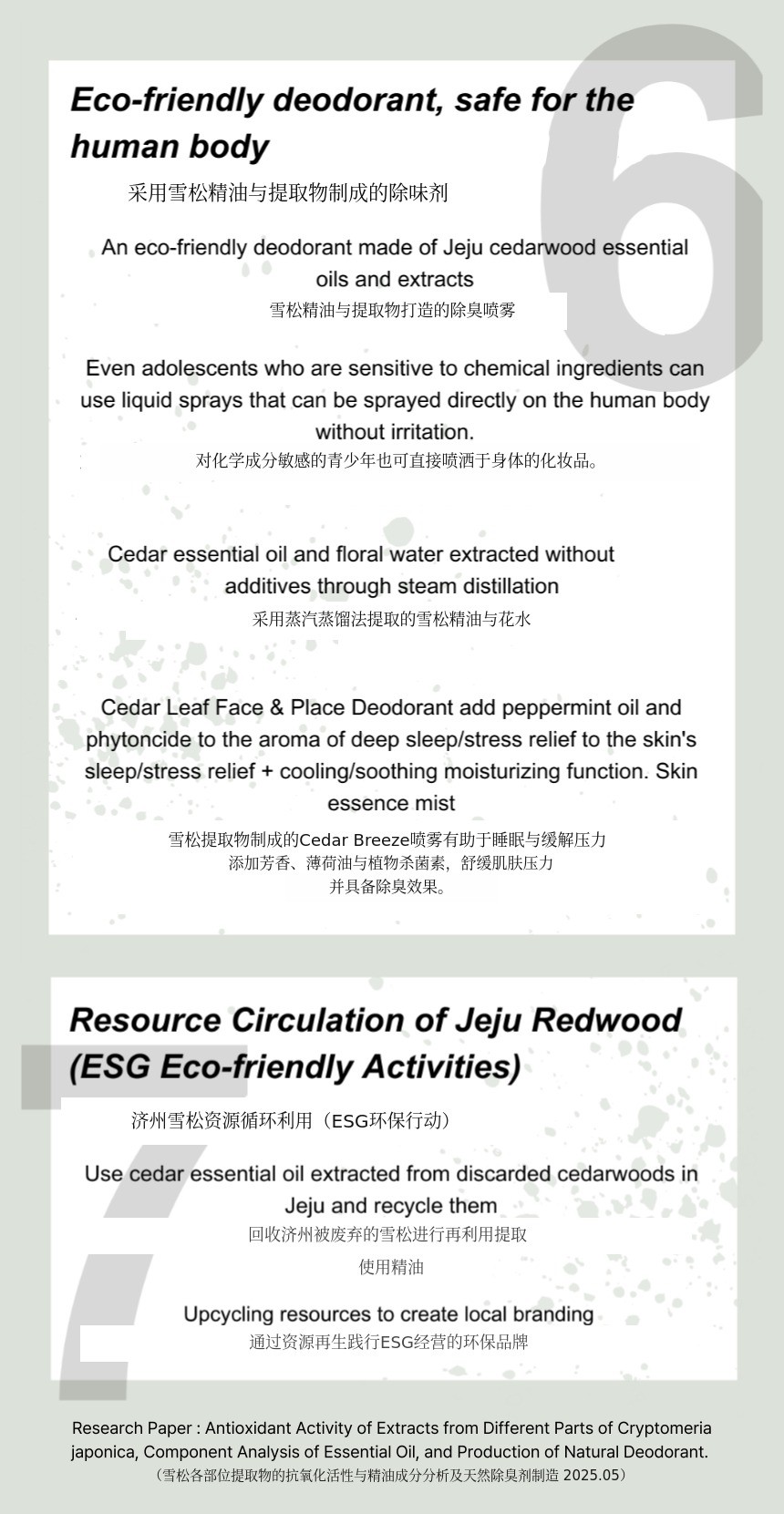 通过新闻得知济州岛的杉树正在引发严重的环境问题。进一步调查后发现,杉树花粉可能引发特应性皮炎和过敏反应,实际上有研究结果显示,在济州岛居住超过2年6个月的人,这种情况更为严重。此外,过于茂密的杉树林会遮挡阳光,阻碍其他生物的生长。基于这些原因,政府宣布将于2023年至2029年期间,投入总计42亿韩元,在巨文岳一带砍伐10万棵杉树。然而,如果将砍伐下来的杉树简单焚烧,会产生二氧化碳导致环境污染,若填埋则需要大量土地和费用。在思考是否能以更好的方式利用这些本应被丢弃的杉树时,发现杉树提取物对Staphylococcus hominis具有出色的抗菌效果,由此看到了其作为天然除臭剂的可能性。