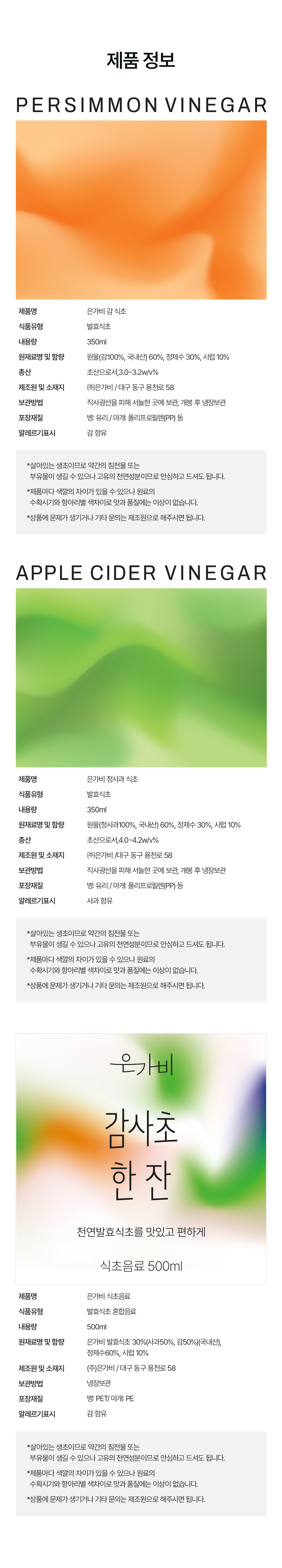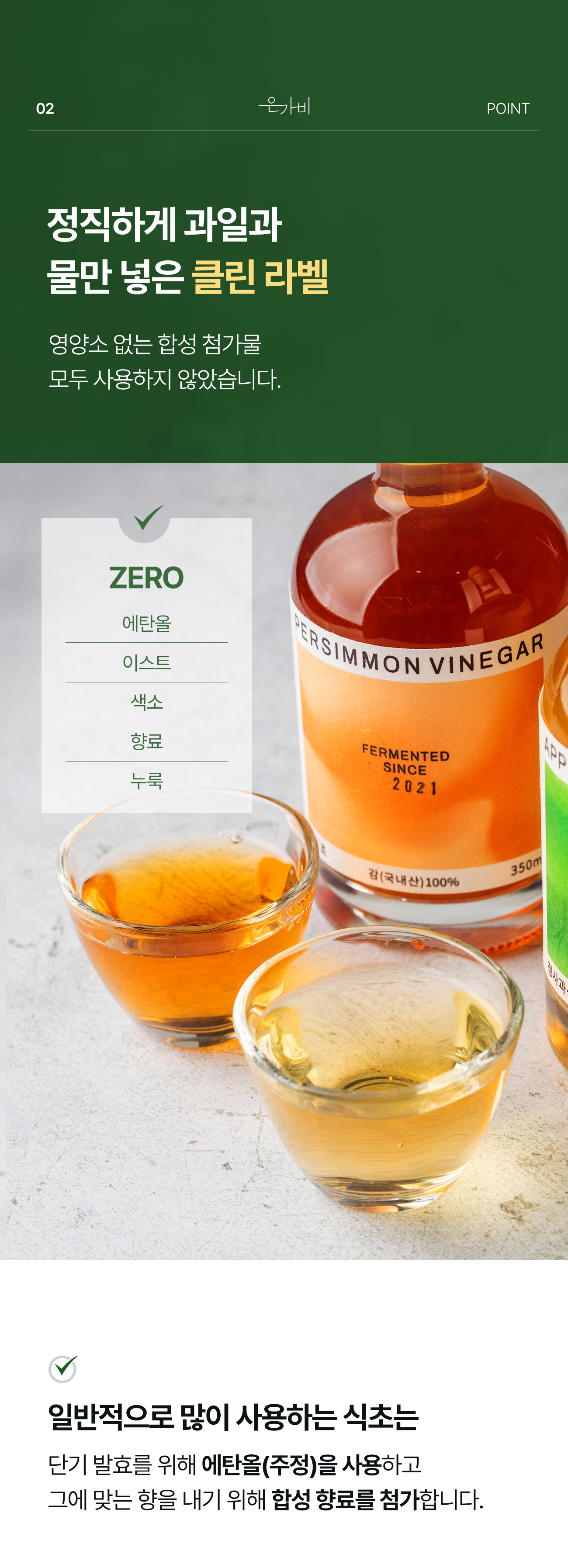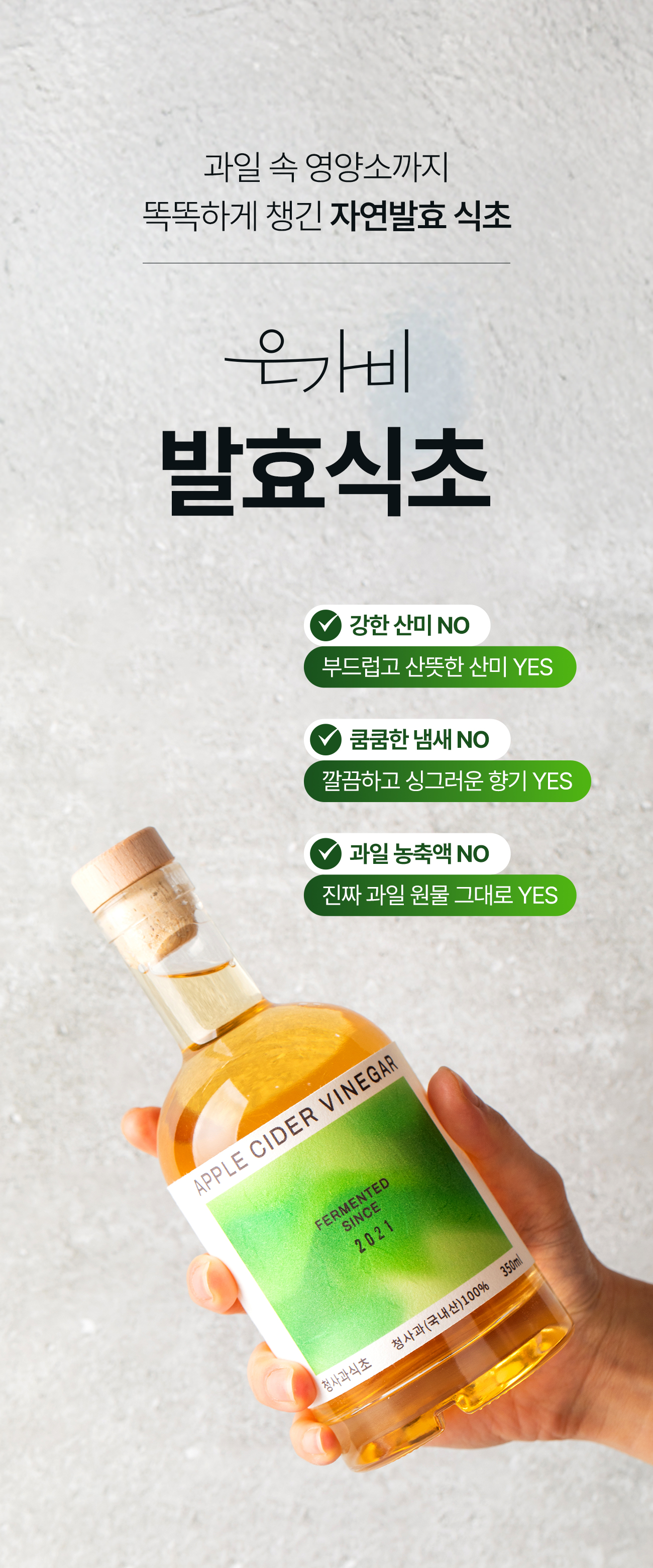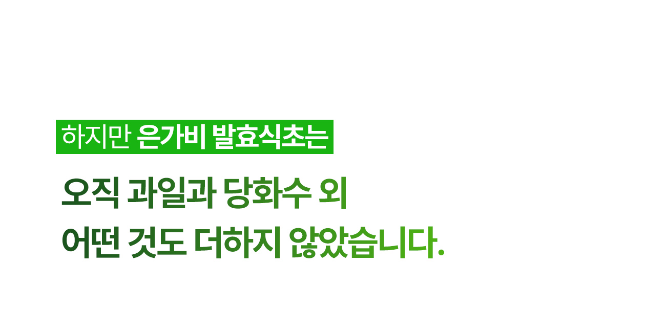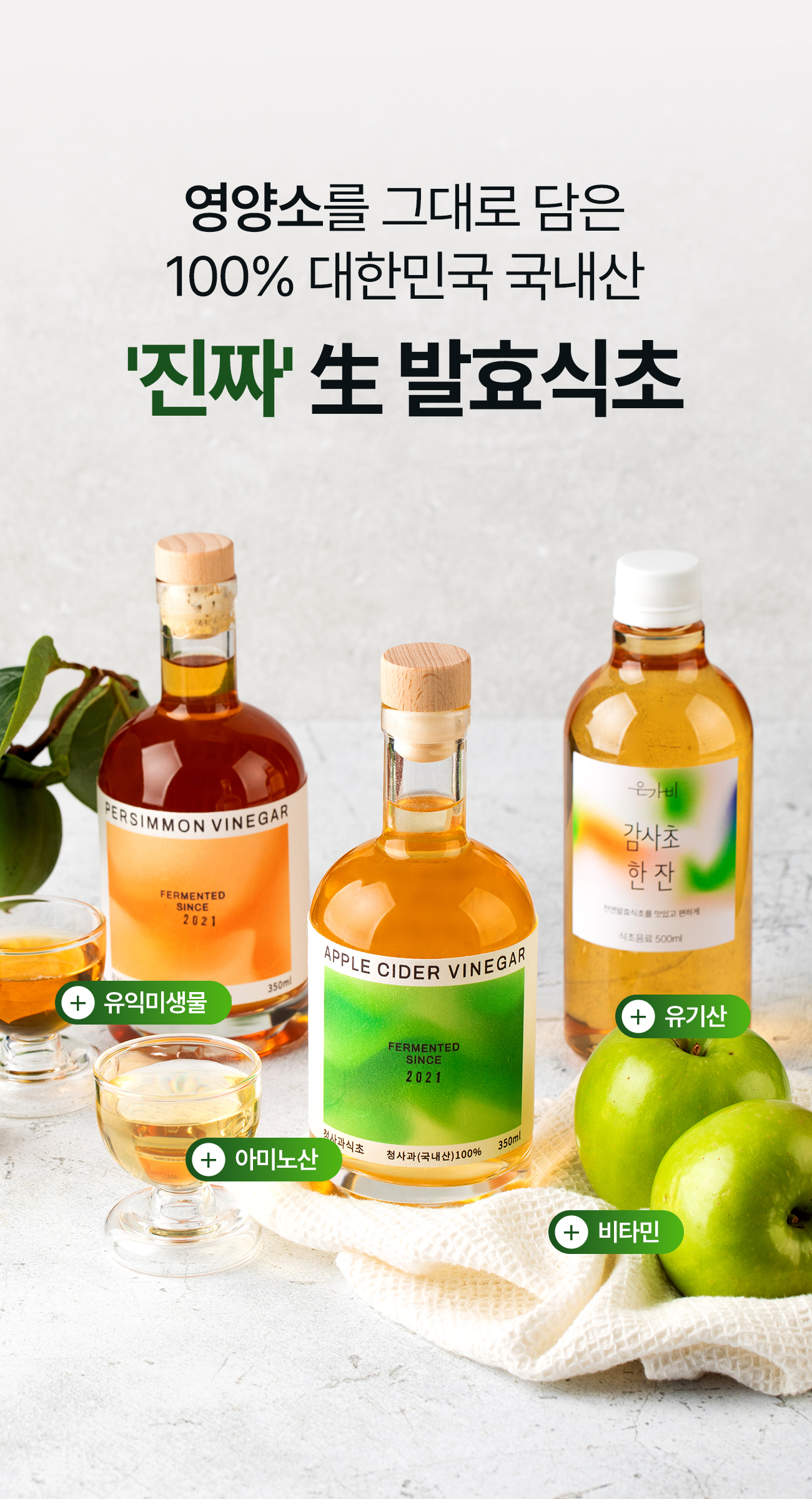 100% 국내산 과일과 당화수 만으로 주정도, 첨가물도, 인공향도 넣지 않은 자연 그대로의 식초를 만들고 있습니다.
