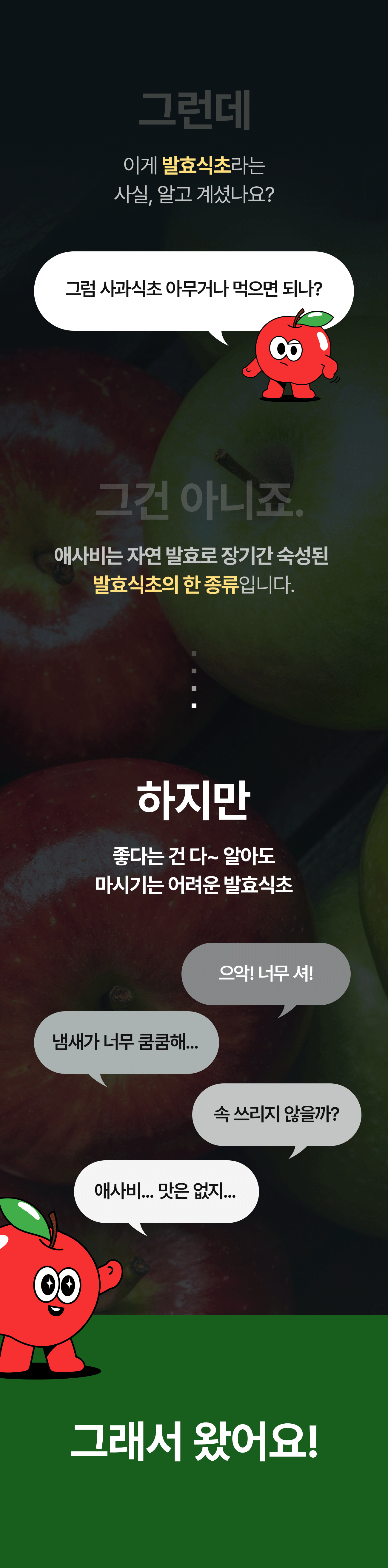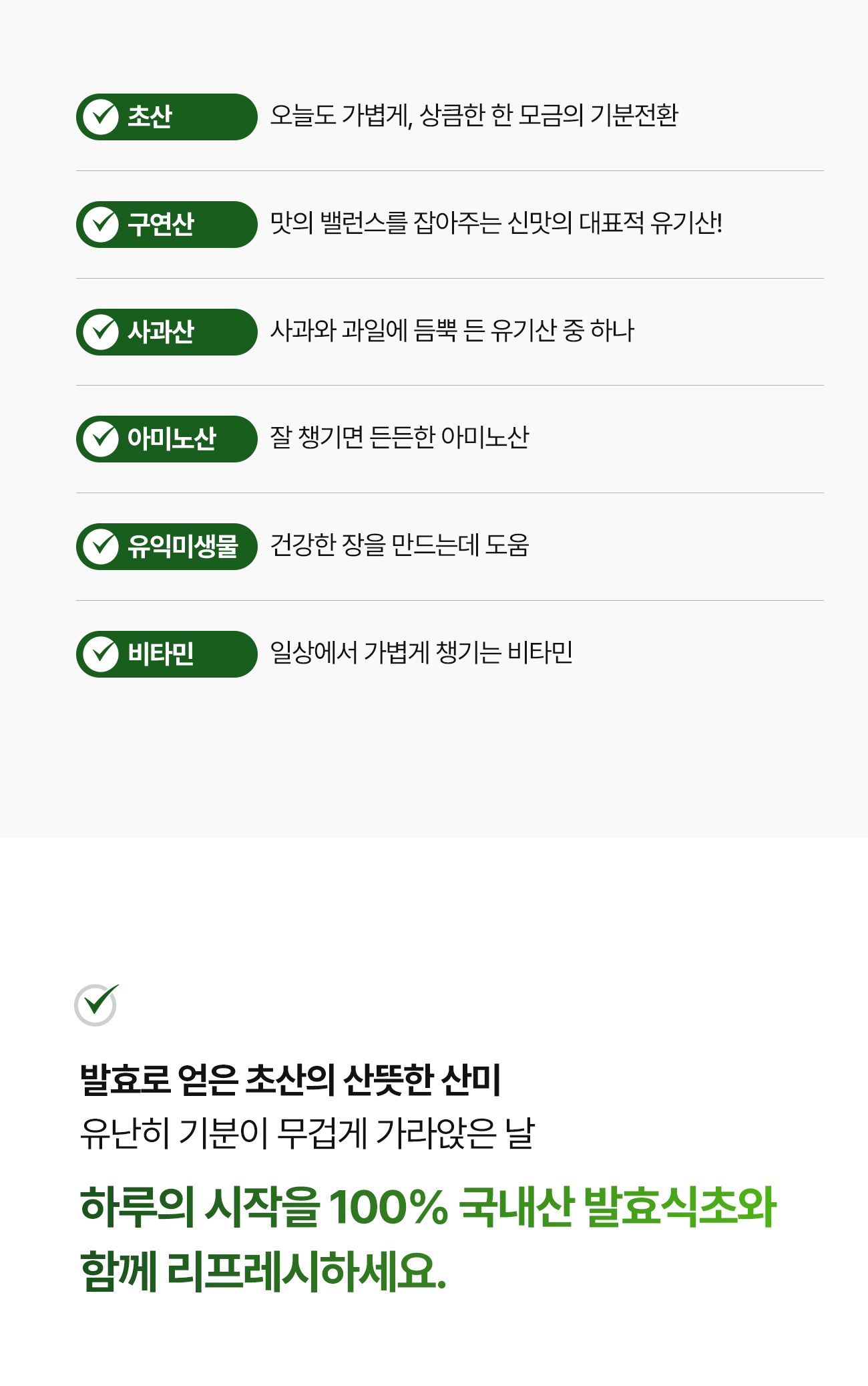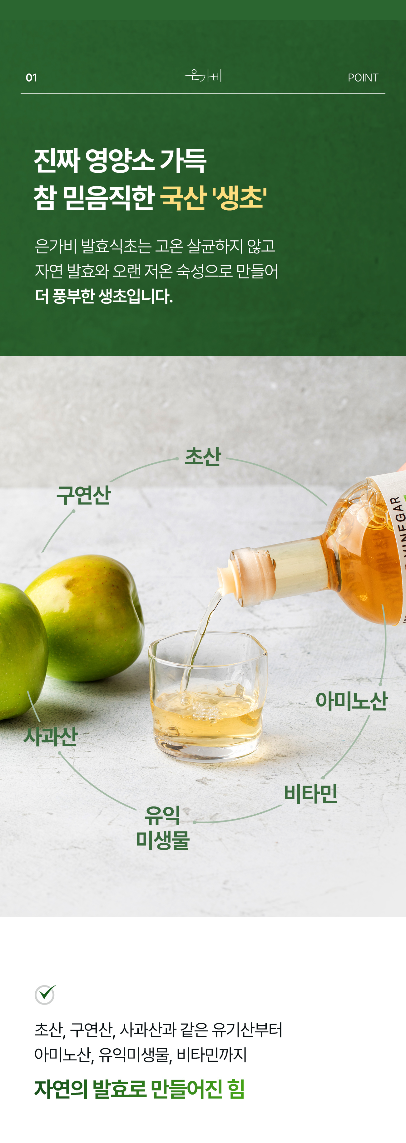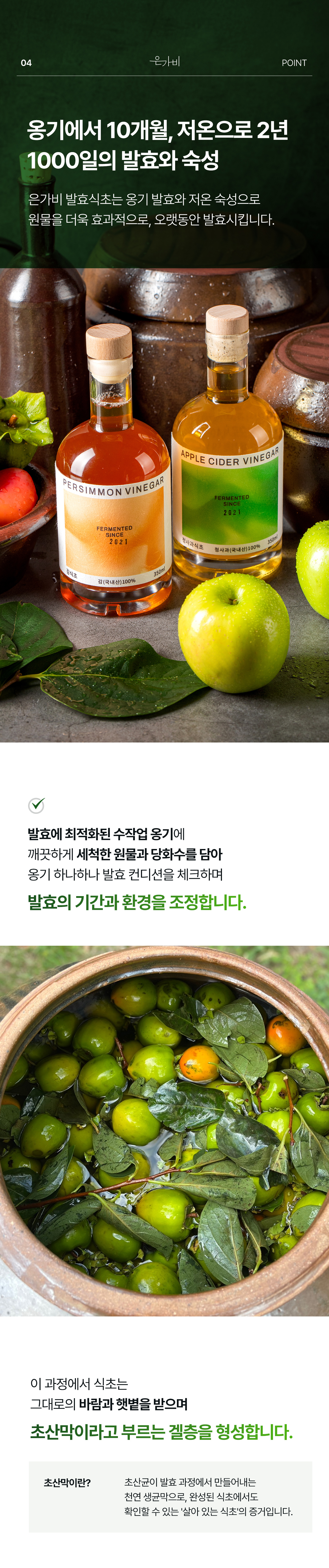 100% 국내산 과일과 당화수 만으로 주정도, 첨가물도, 인공향도 넣지 않은 자연 그대로의 식초를 만들고 있습니다.