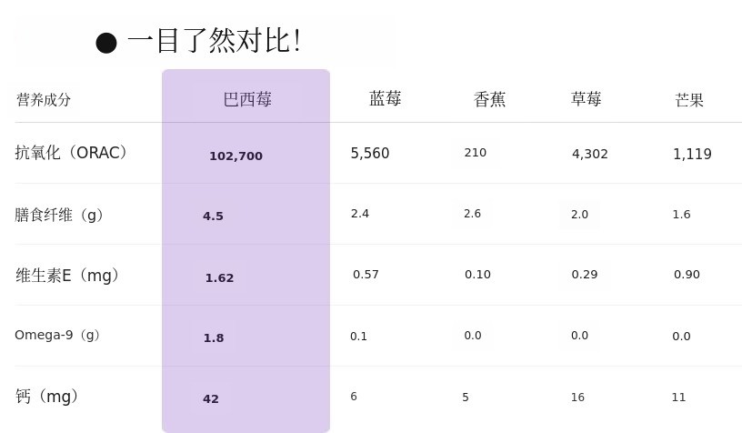 即使将阿萨伊莓、蓝莓、香蕉、草莓、芒果这五种水果进行比较,无论是抗氧化指数、膳食纤维、维生素E、欧米伽9、钙含量都可以发现阿萨伊莓的营养成分远远高于其他水果!!