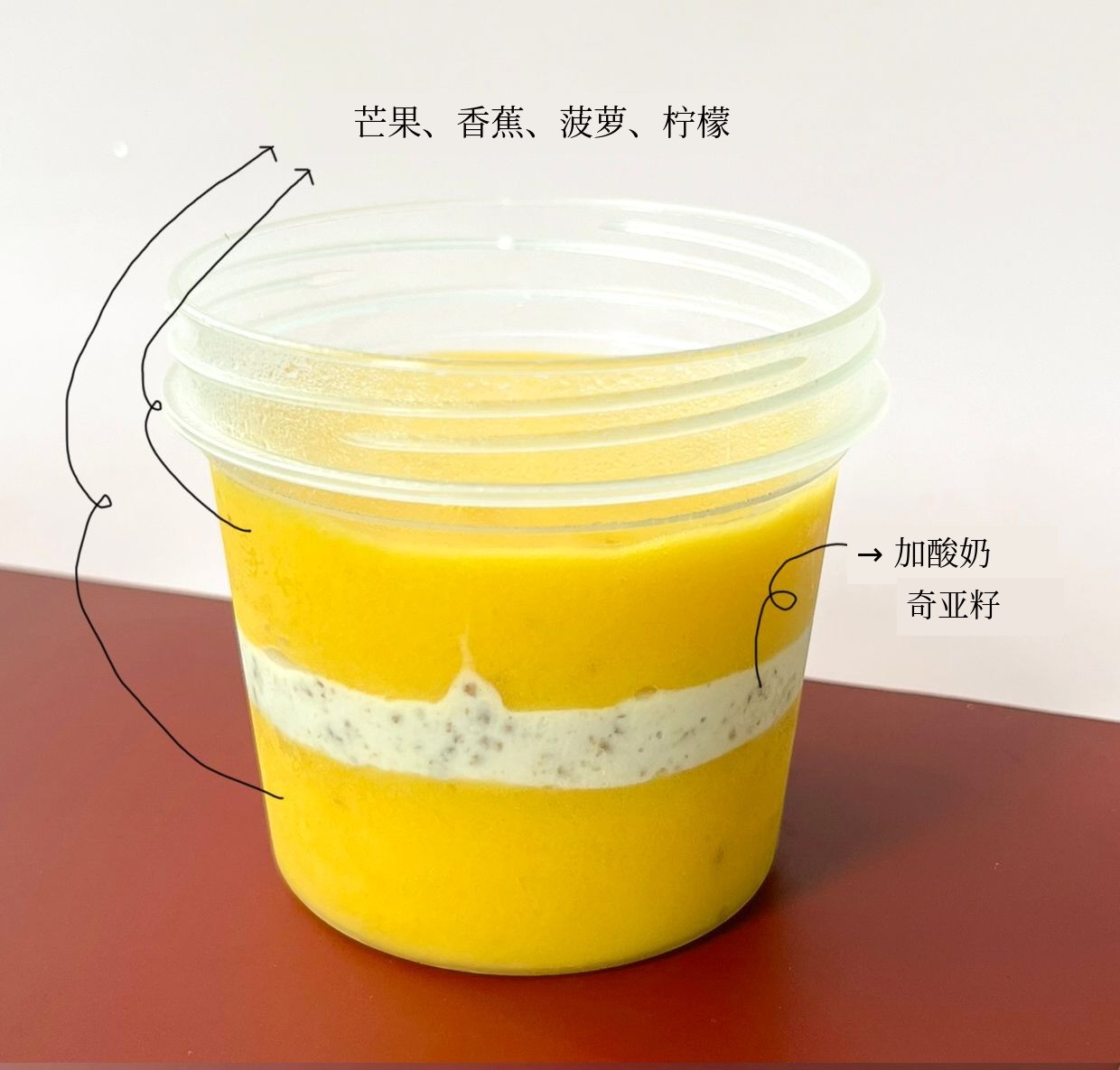由芒果、菠萝、香蕉组成的搭配芒果和 香蕉的甜味与菠萝的清新口感 可以同时感受到。中间加入了增加饱腹感的奇亚籽,也能感受到咀嚼的口感!