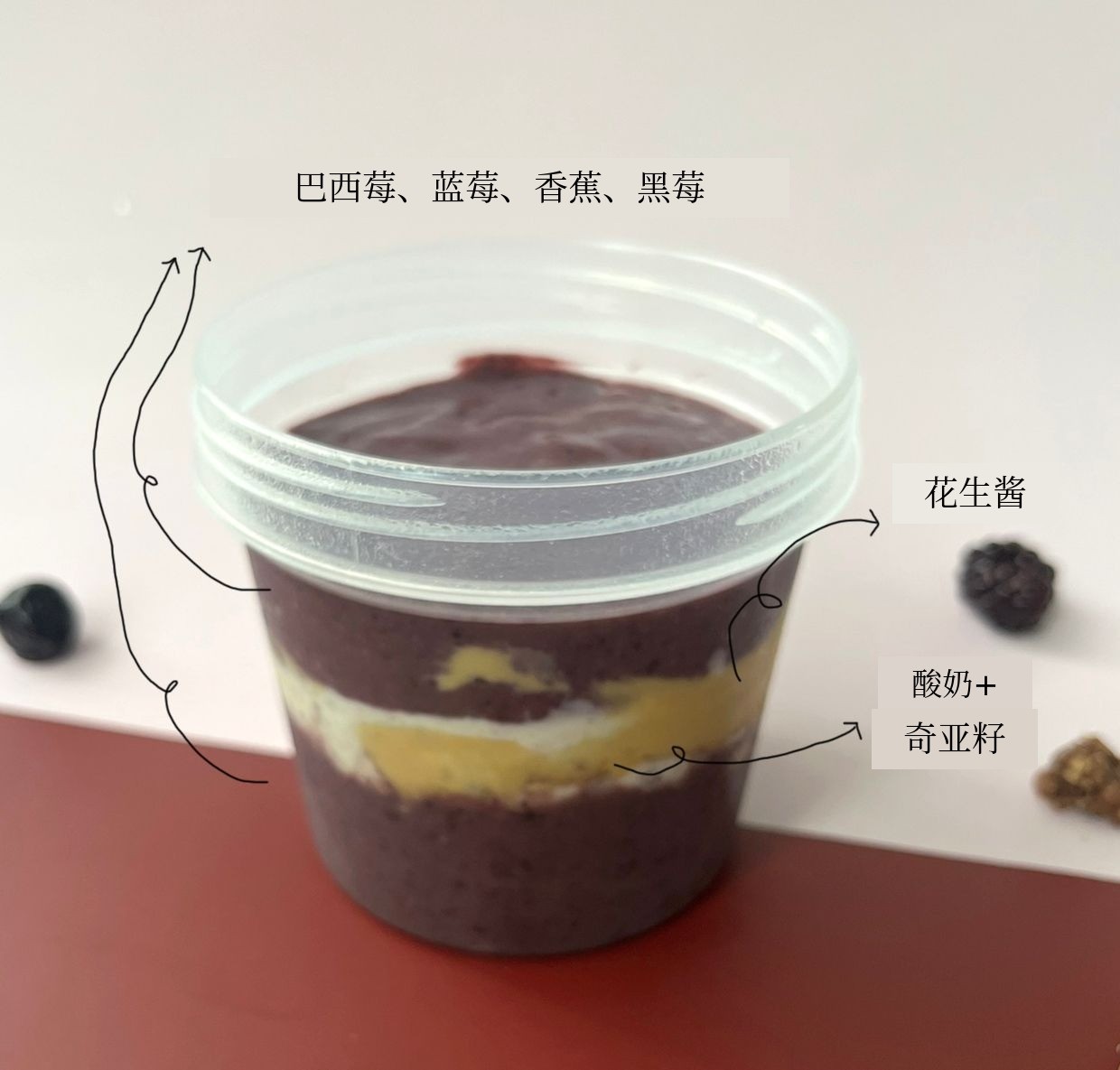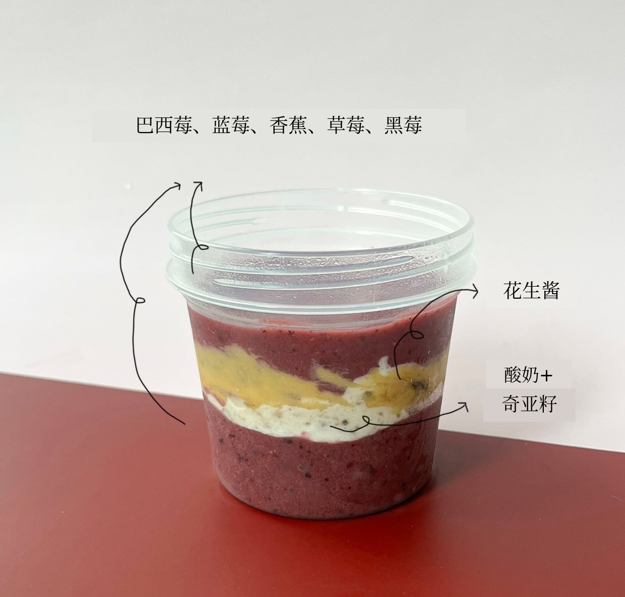 由巴西莓、蓝莓、香蕉、黑莓组成的搭配,浓郁的巴西莓和蓝莓风味 可以品尝到。中间加入了花生酱,提升了香气,还有增加饱腹感的奇亚籽,带来丰富的咀嚼口感!