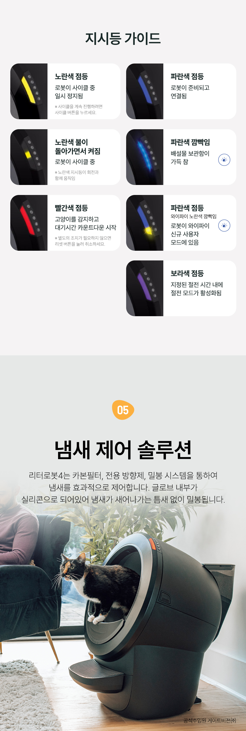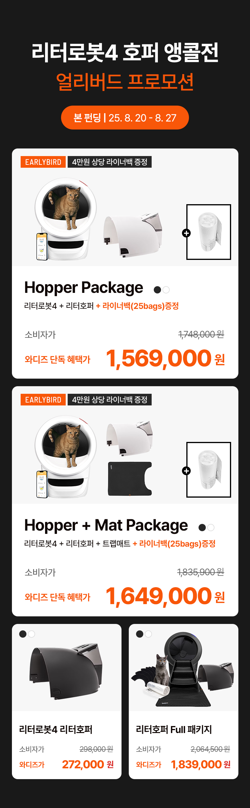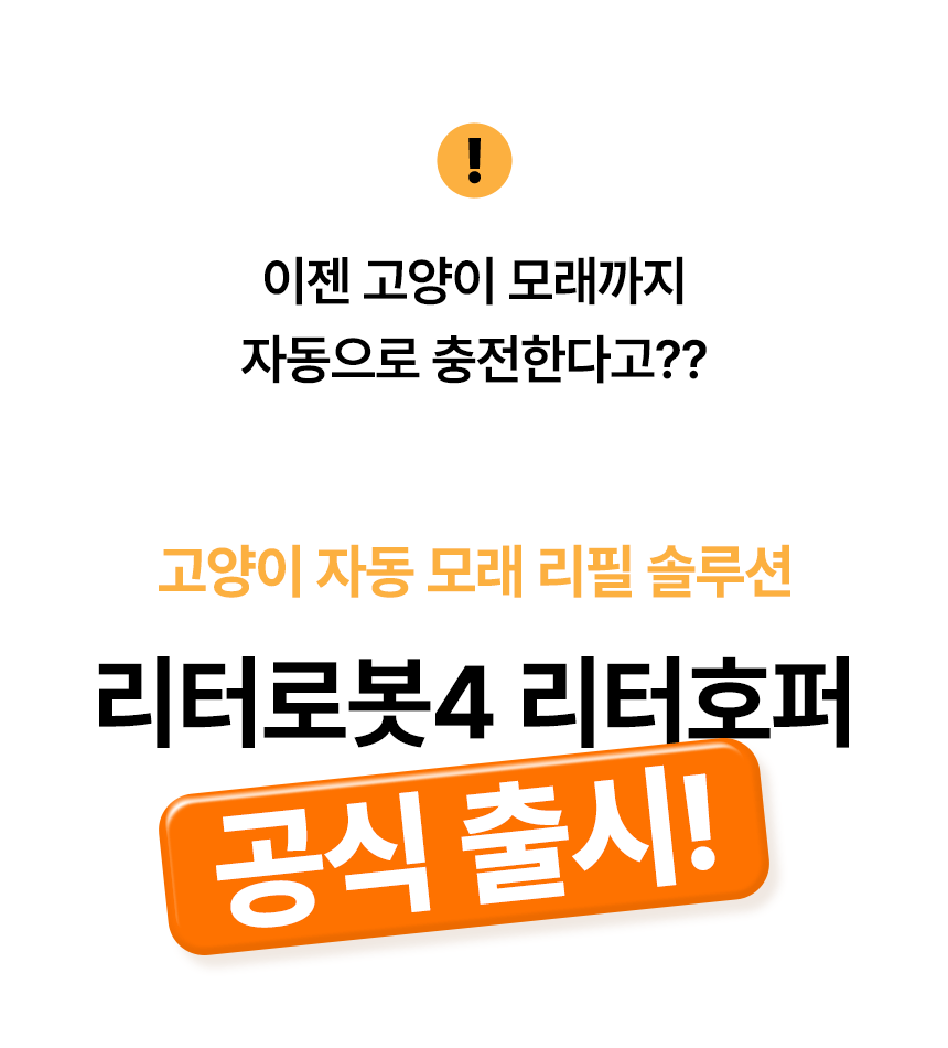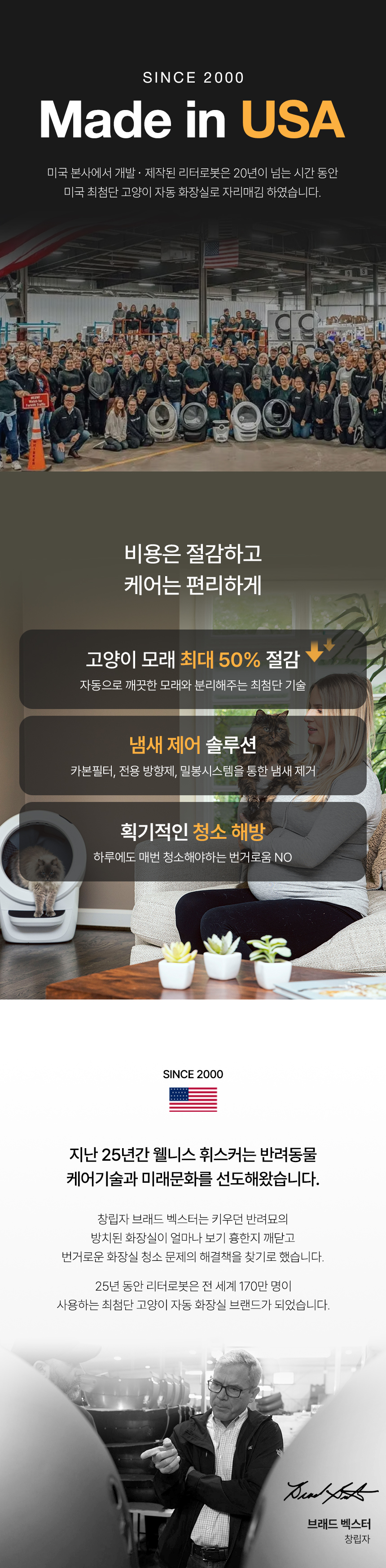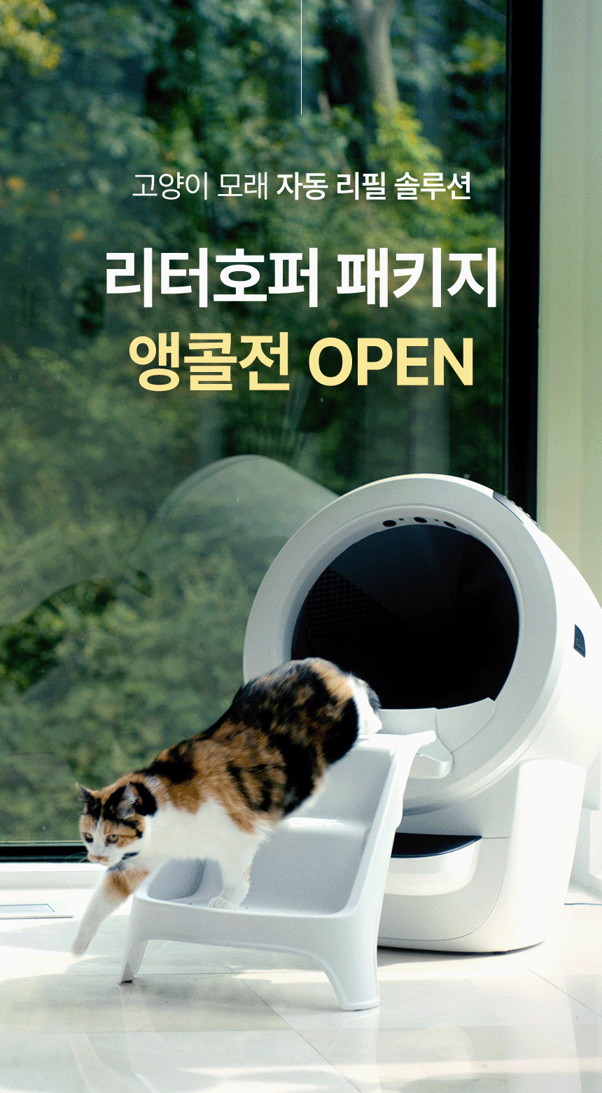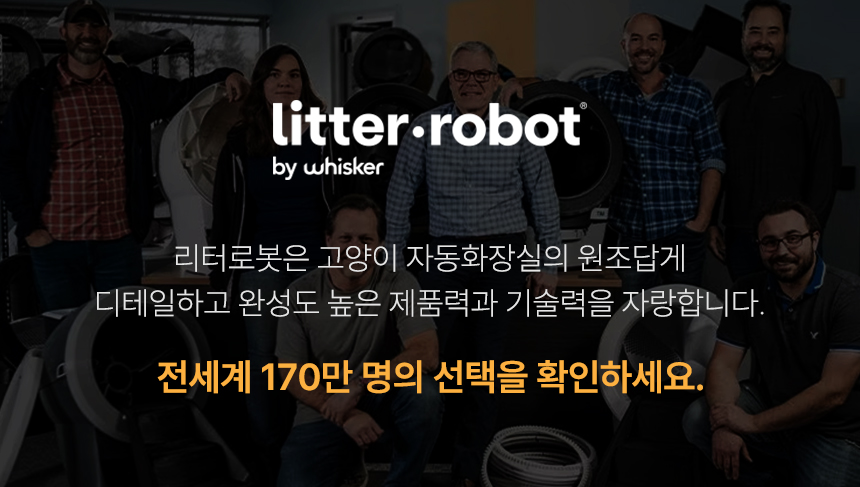 25년 역사의 전세계 170만명이 사용하는 최첨단 고양이 자동 화장실 브랜드 리터로봇은 미국 고양이 자동 화장실 제품으로 2024년, 2022년 타임지 최고의 발명품 선정 및 포브스, HGTV, GODD HOUSEKEEPING 등 미국 언론에서 인정한 제품으로 한국에 정식 런칭하였습니다. 리터로봇은 서포터분들의 소중한 의견을 귀담아 향후에도 꾸준히 업그레이드 되는 제품으로 찾아뵙겠습니다.
