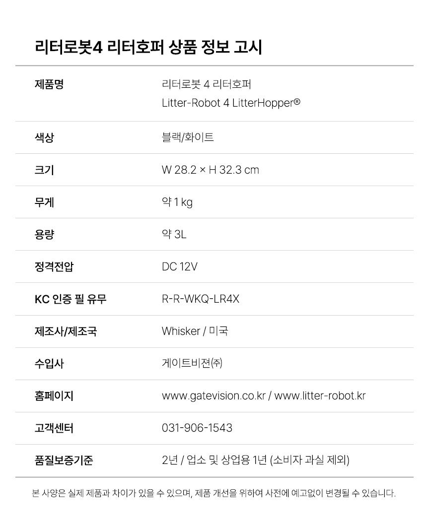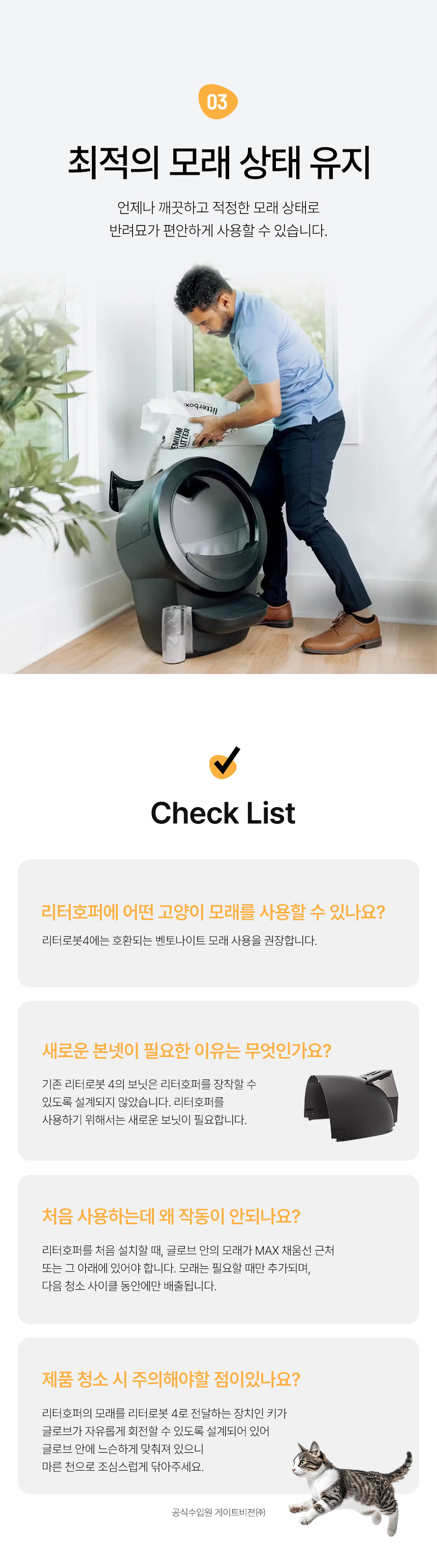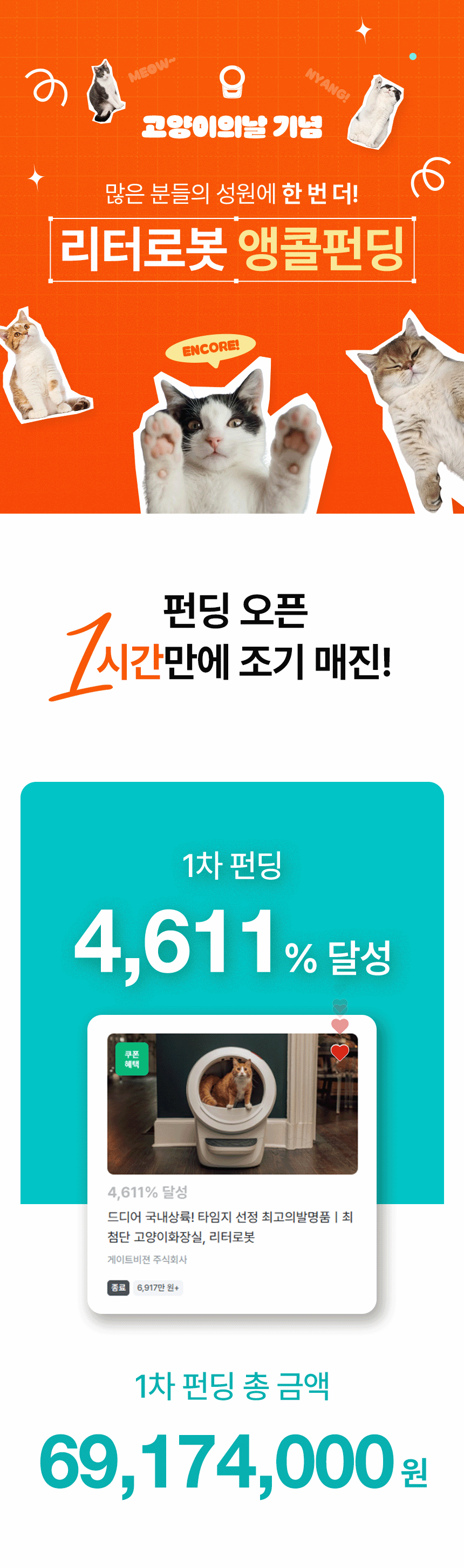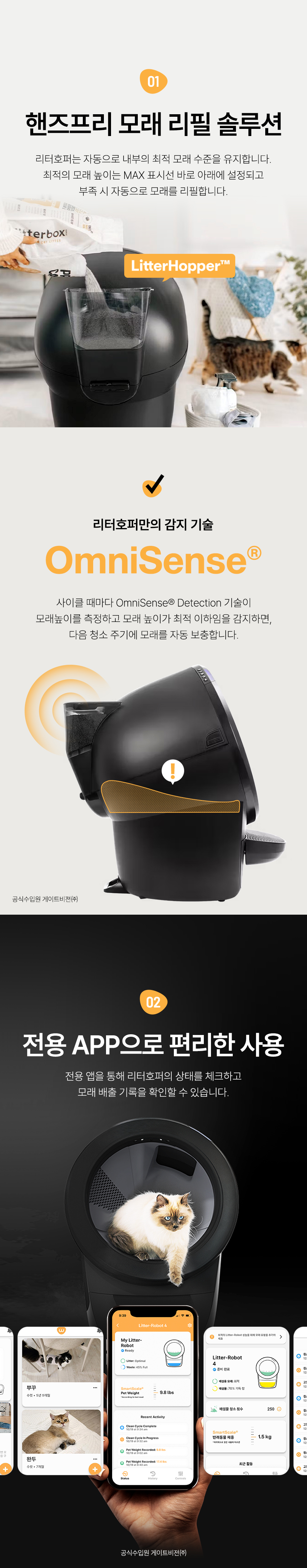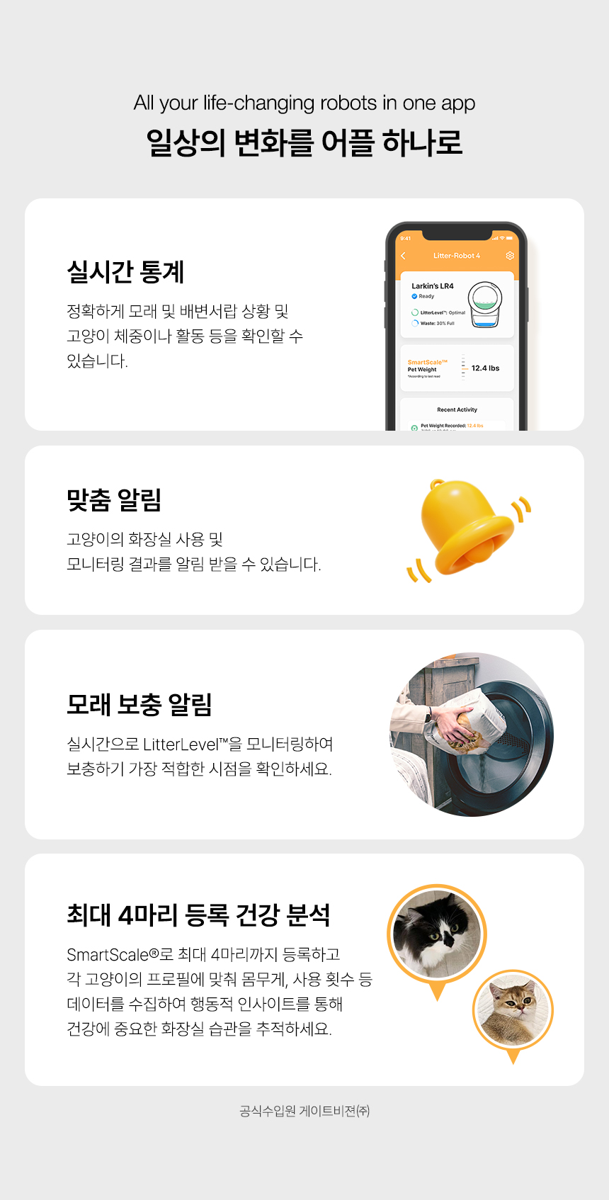 25년 역사의 전세계 170만명이 사용하는 최첨단 고양이 자동 화장실 브랜드 리터로봇은 미국 고양이 자동 화장실 제품으로 2024년, 2022년 타임지 최고의 발명품 선정 및 포브스, HGTV, GODD HOUSEKEEPING 등 미국 언론에서 인정한 제품으로 한국에 정식 런칭하였습니다. 리터로봇은 서포터분들의 소중한 의견을 귀담아 향후에도 꾸준히 업그레이드 되는 제품으로 찾아뵙겠습니다.