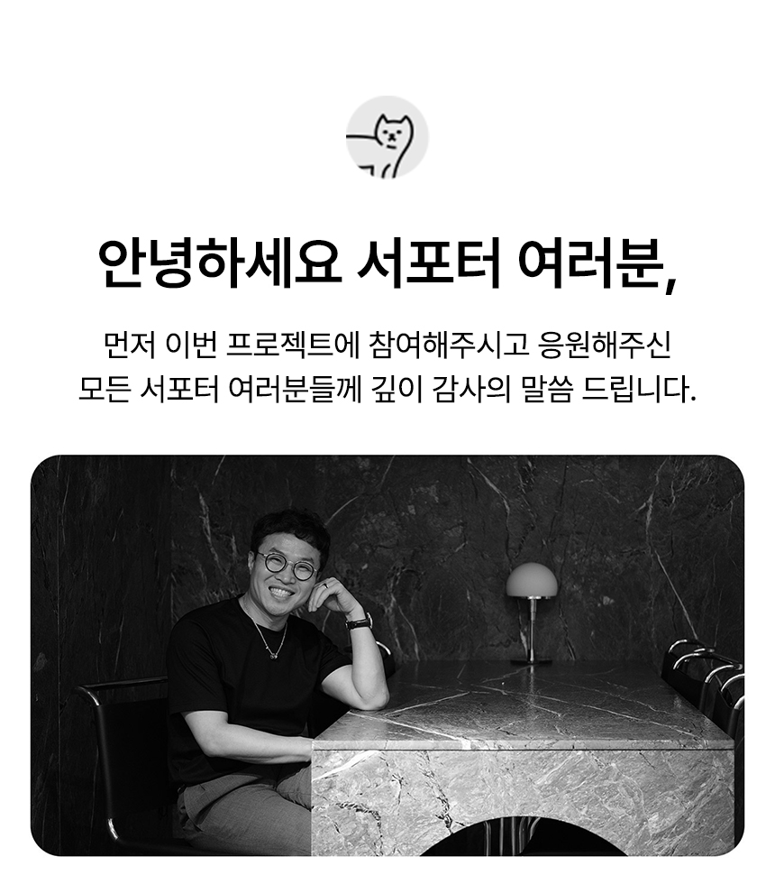 서포터님 한 분, 한 분의 관심이 많은 힘이 됩니다. 프로젝트가 끝나더라도 많은 소통과 관심 부탁드립니다. :) 서포터님들의 지속적인 관심과 응원이 저희의 모든 원동력이 됩니다. 앞으로도 잘 부탁드리겠습니다. 감사합니다.